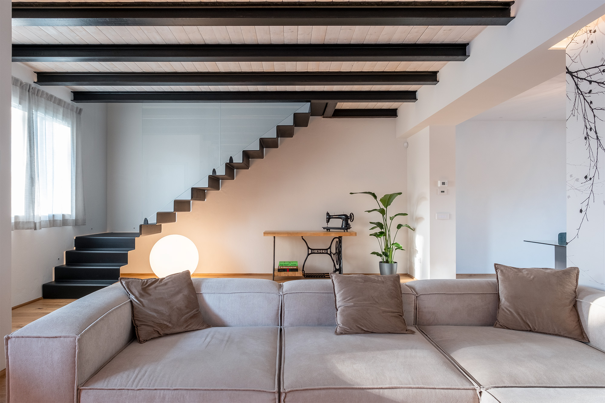 Una grande scala a giorno in lamiera pressopiegata collega l’ambiente giorno di piano terra con l’ambiente notte di piano primo.
