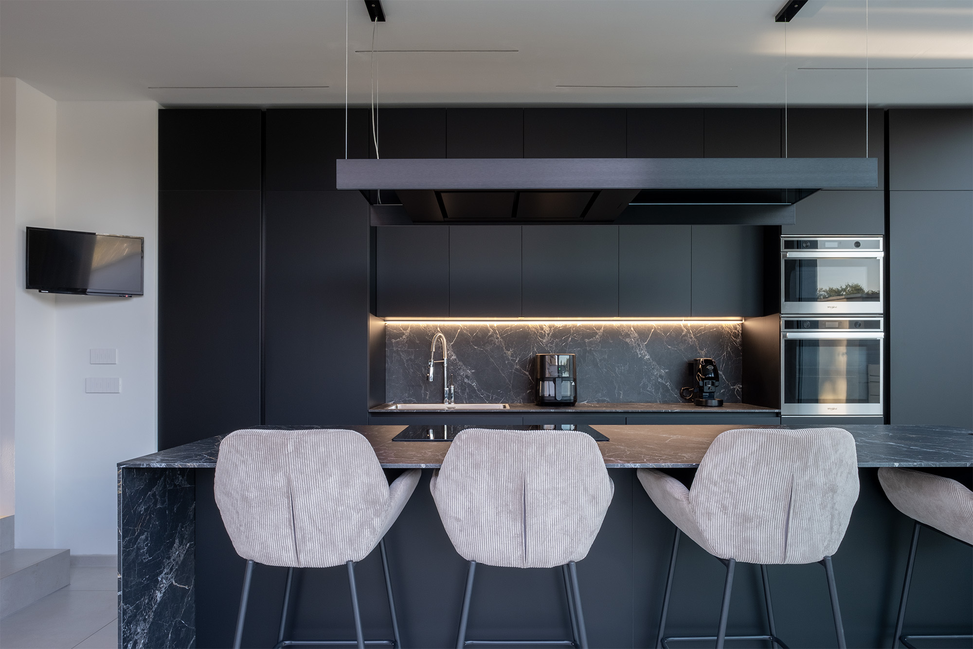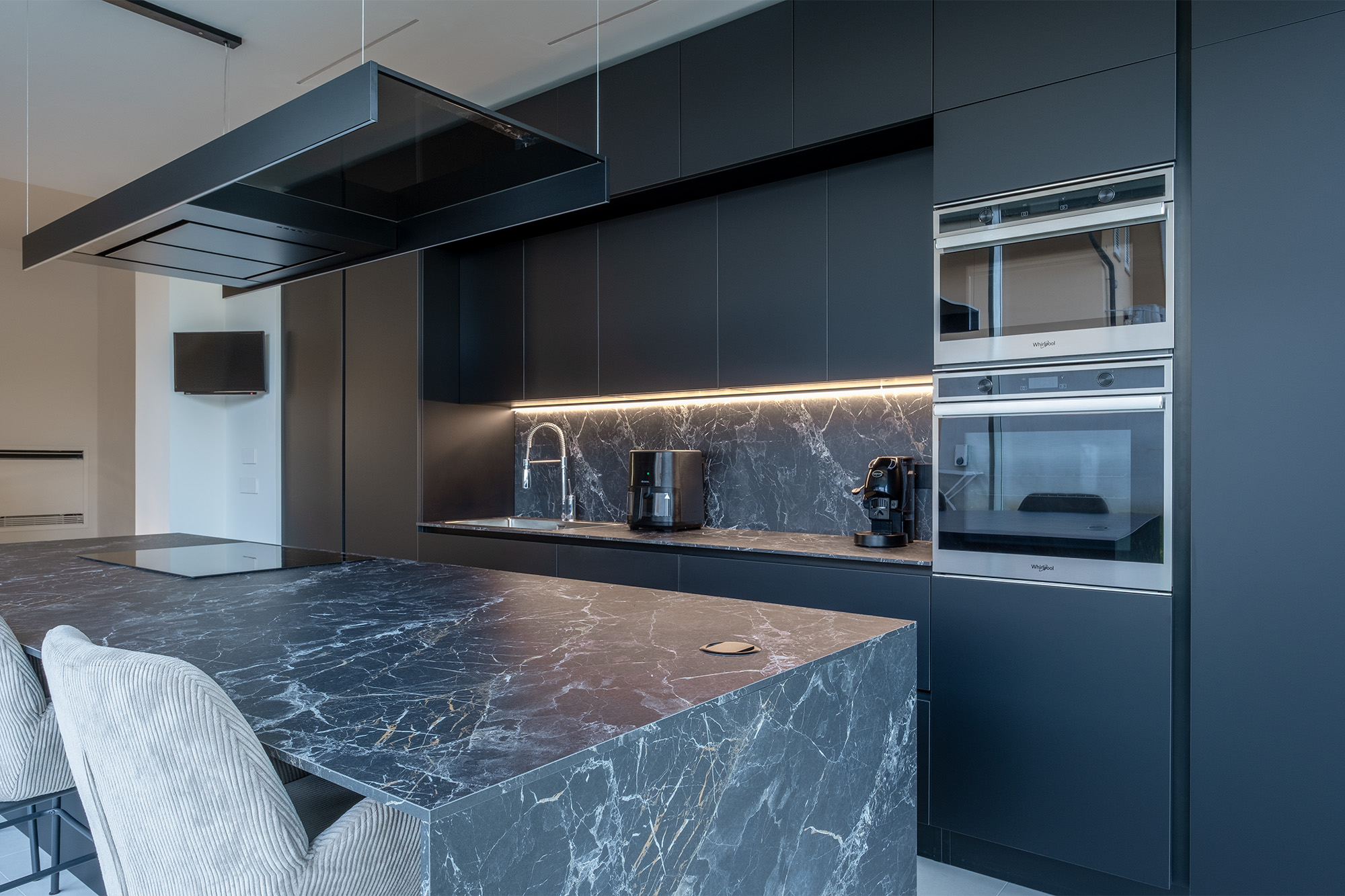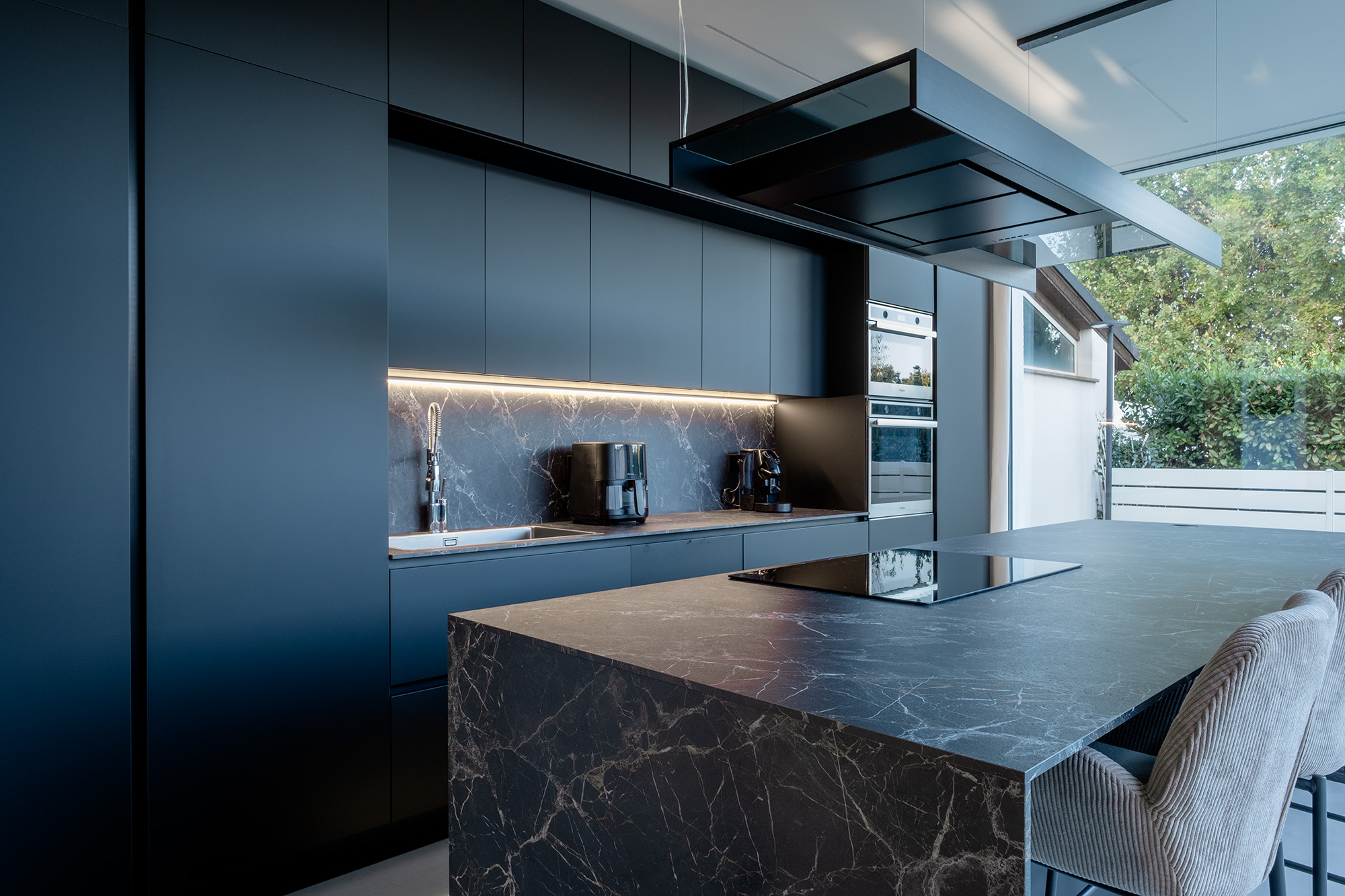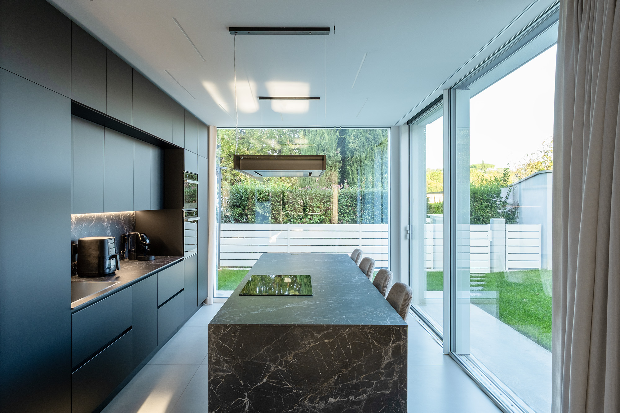 Nel volume in ampliamento al piano terra si colloca l’ambiente cucina con una grande isola che affaccia sul giardino esclusivo della casa. Le grandi vetrate danno una sensazione di essere quasi in una cucina esterna e permettono di sfruttare al massimo la luce ed il calore del sole nei periodi invernali, data la sua ottima esposizione.