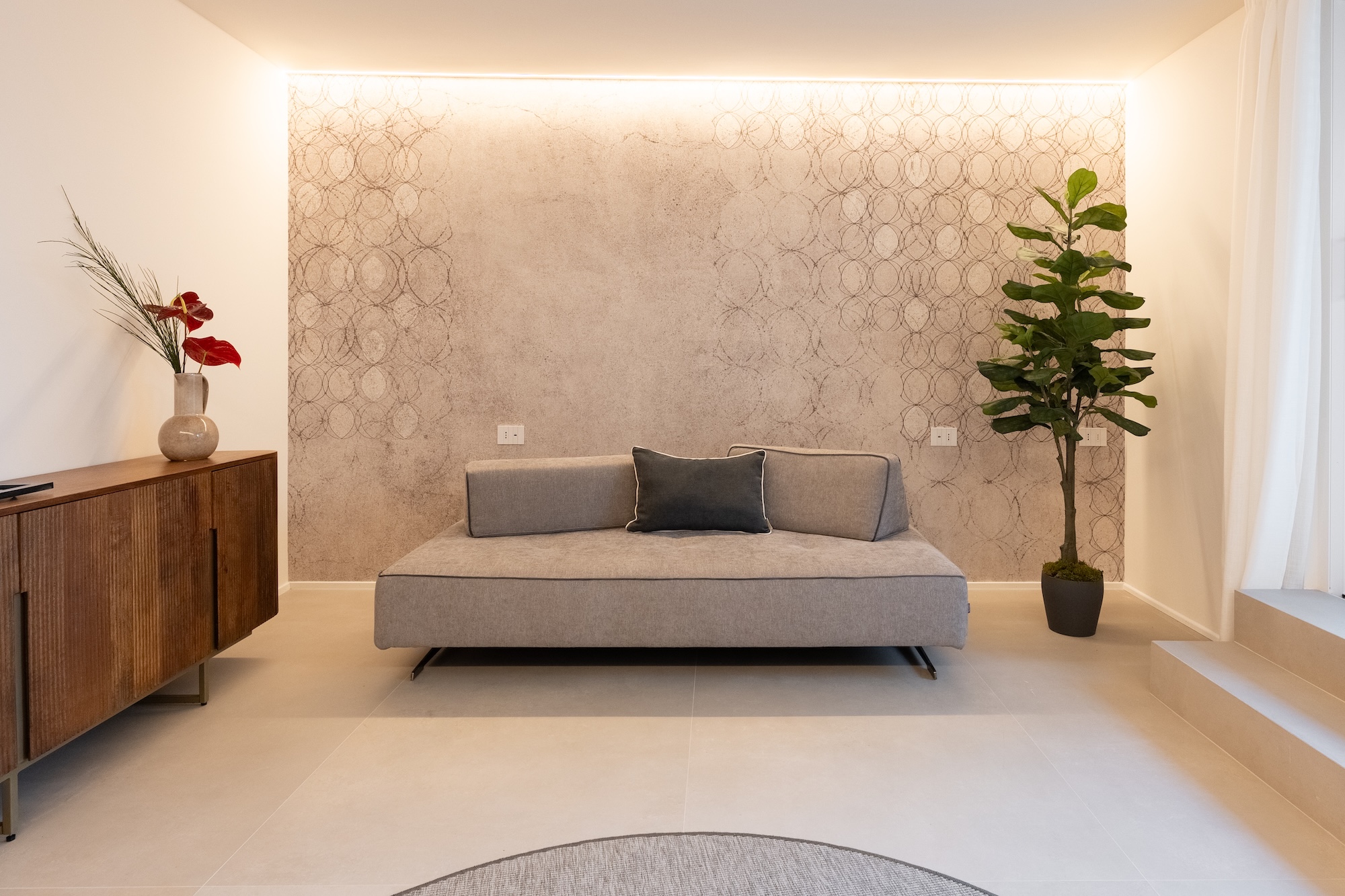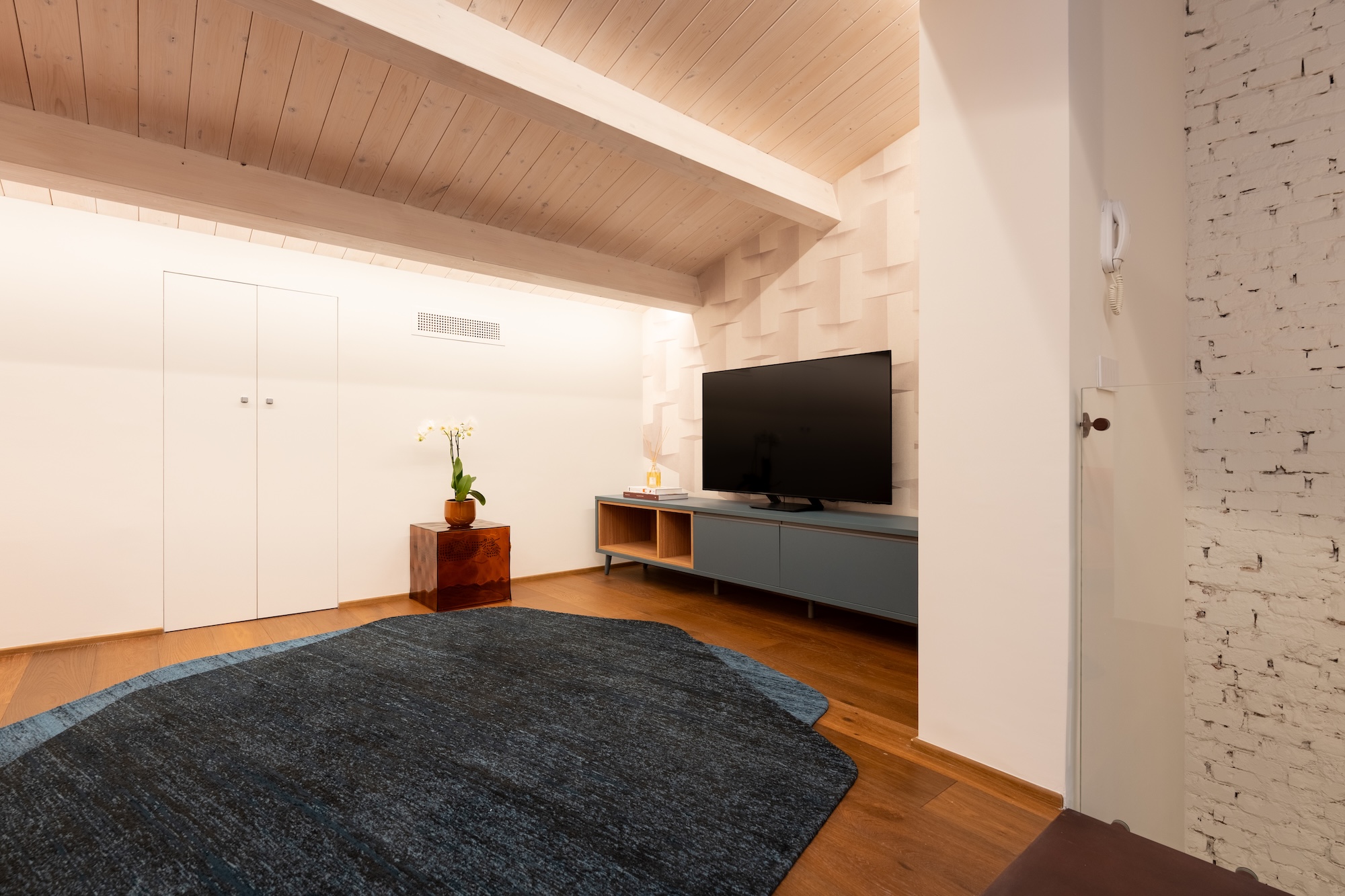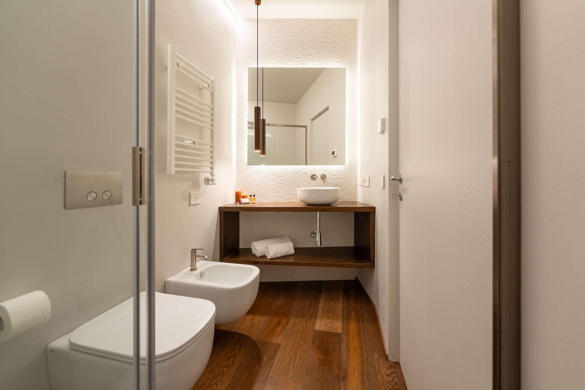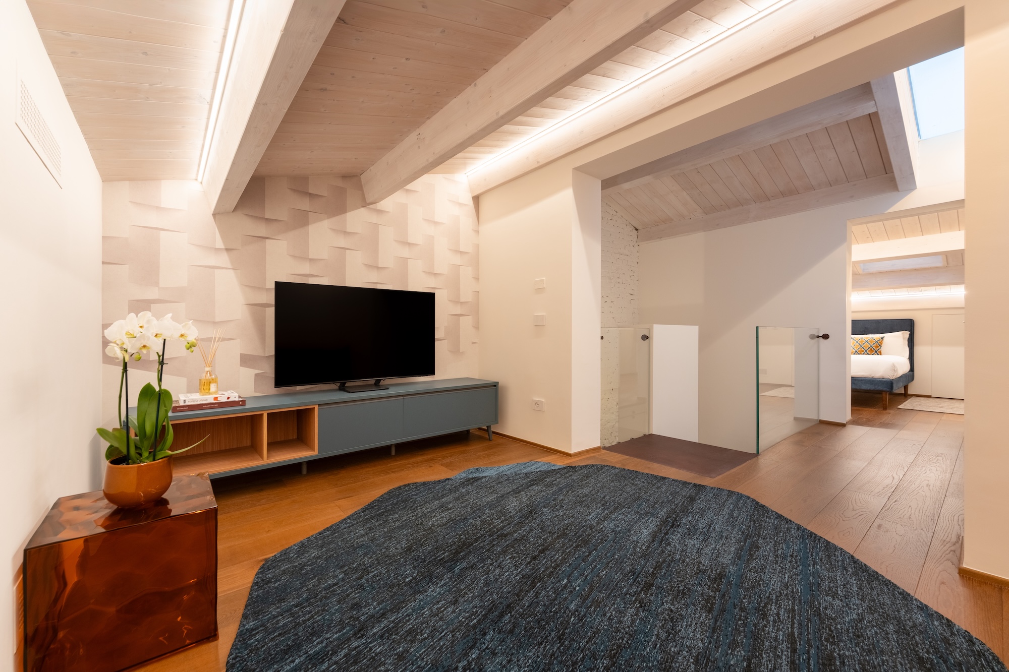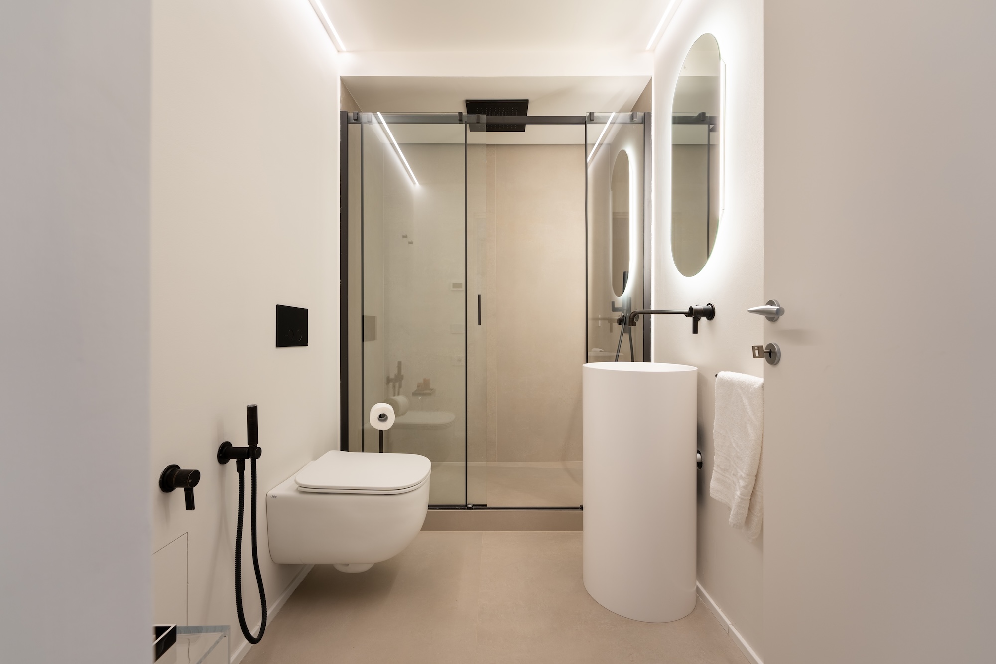 La scelta dei materiali e delle finiture di pregio contribuisce in modo determinante alla definizione del carattere dell’intervento: parquet in noce europeo, superfici in resina, gres porcellanato a basso spessore e carte da parati di alta qualità costruiscono un linguaggio materico elegante e contemporaneo, in equilibrio con l’elemento metallico centrale.