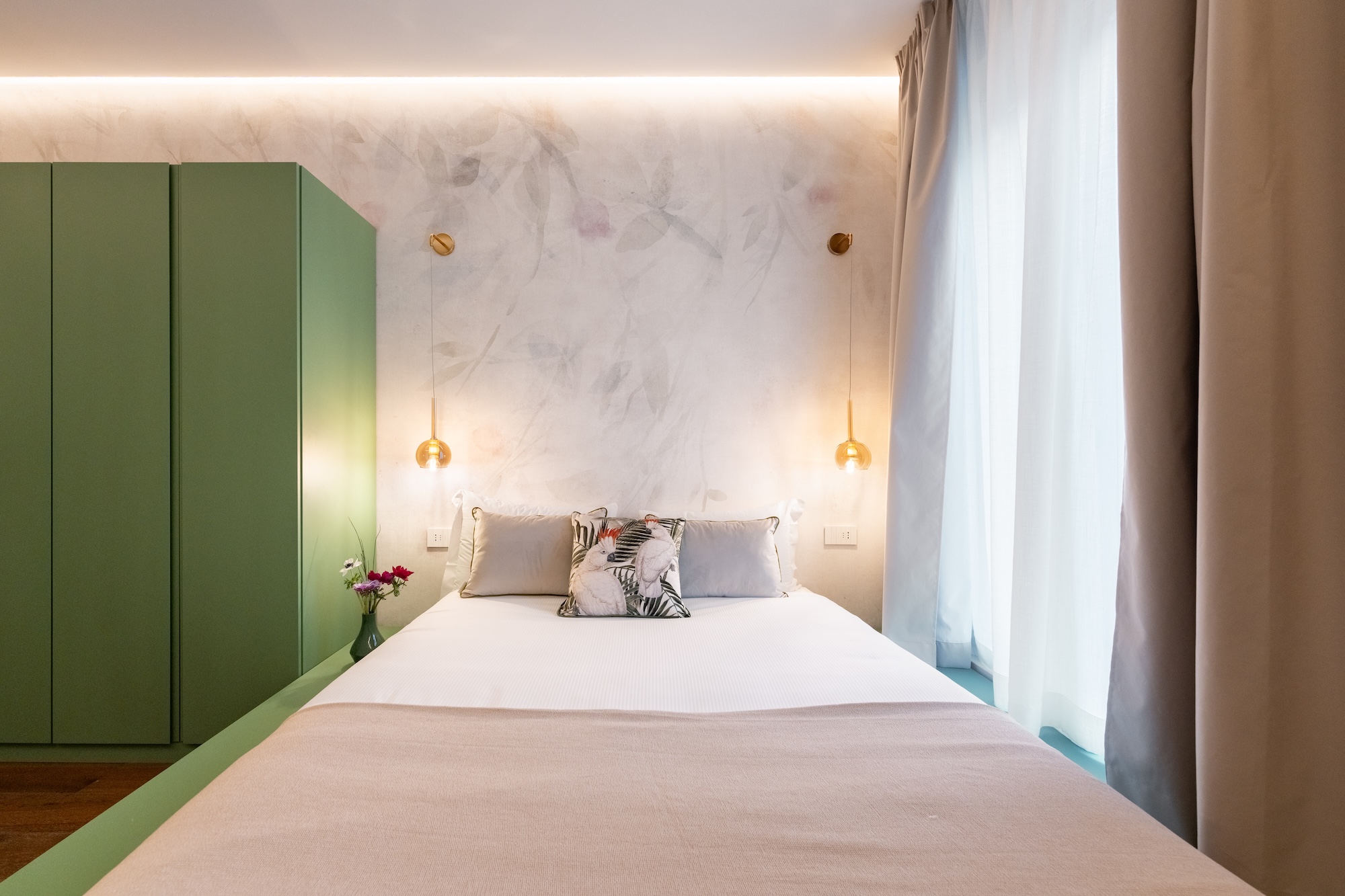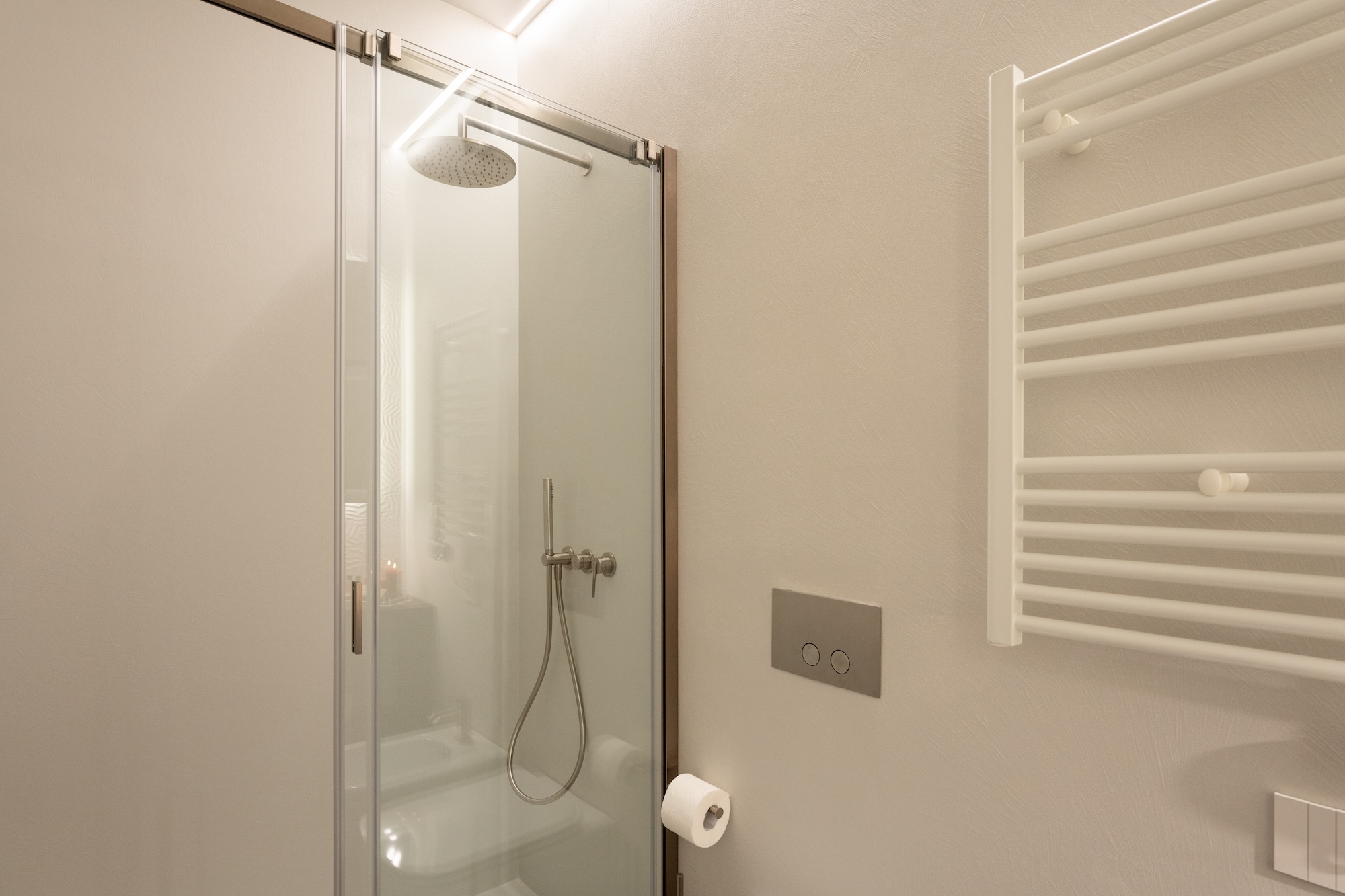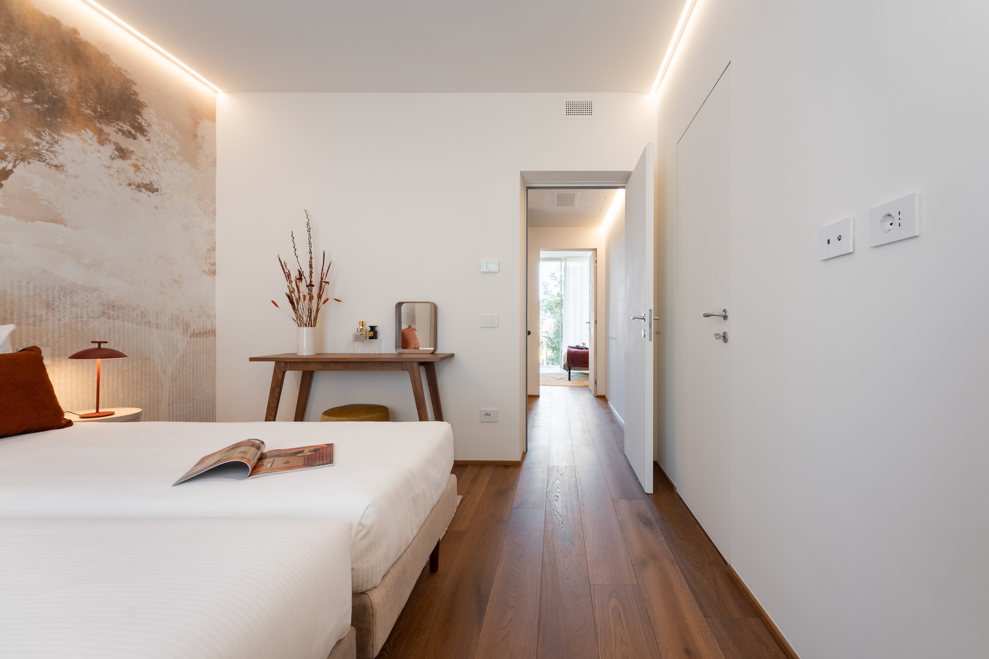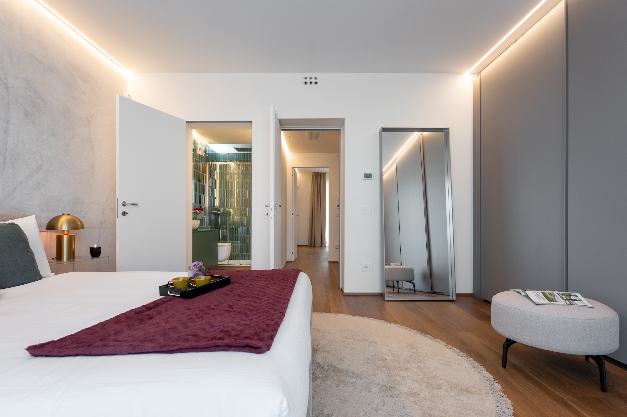 La scelta dei materiali e delle finiture di pregio contribuisce in modo determinante alla definizione del carattere dell’intervento: parquet in noce europeo, superfici in resina, gres porcellanato a basso spessore e carte da parati di alta qualità costruiscono un linguaggio materico elegante e contemporaneo, in equilibrio con l’elemento metallico centrale.