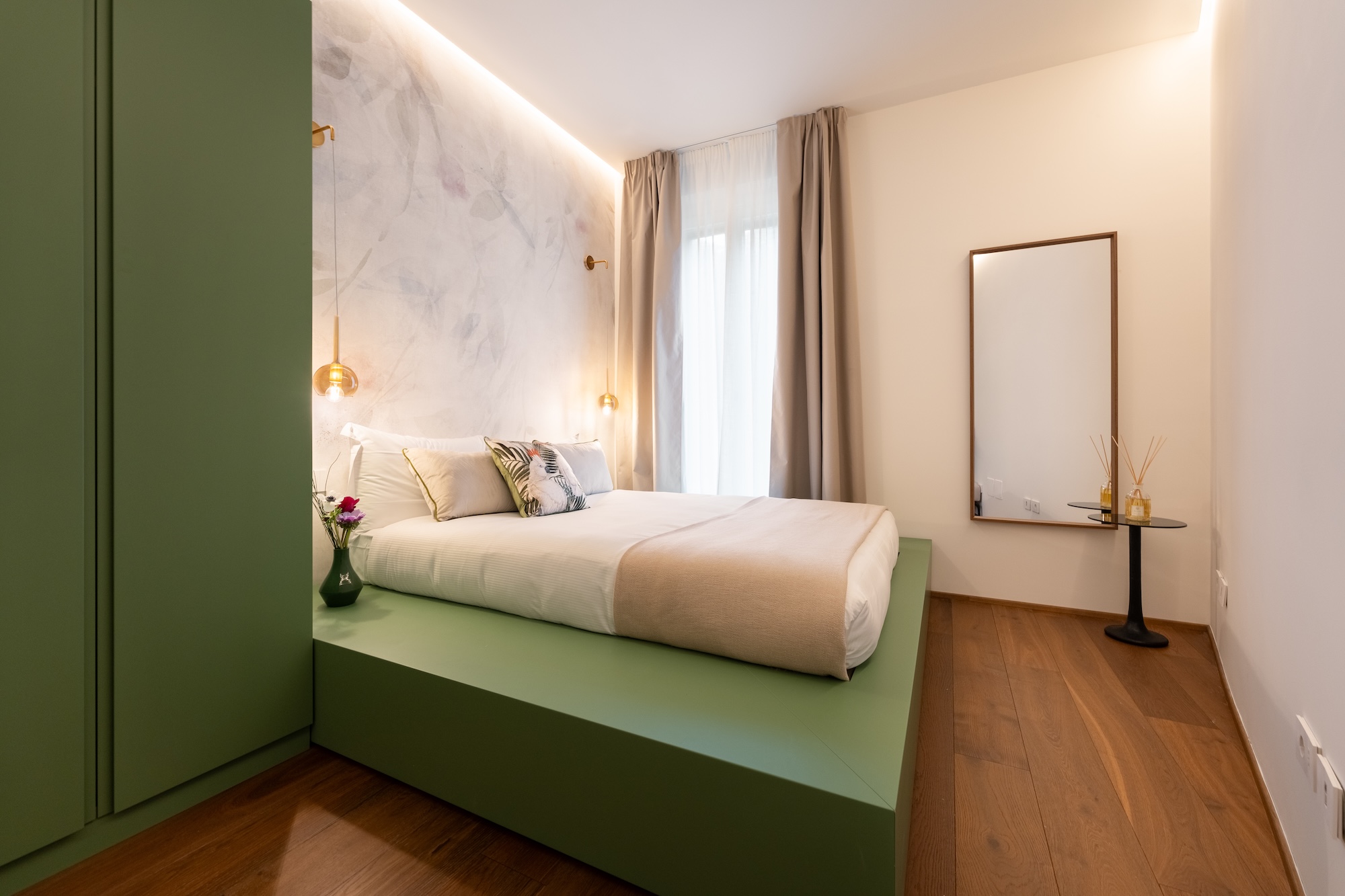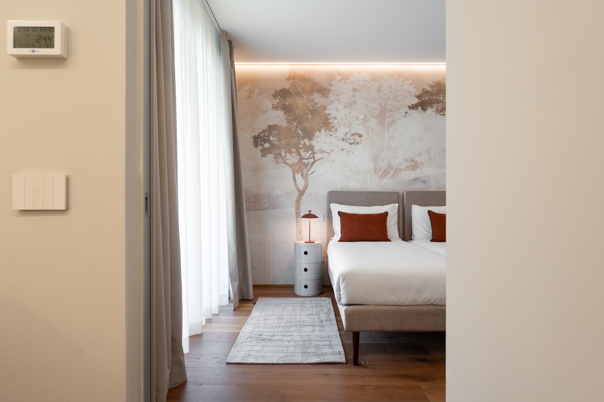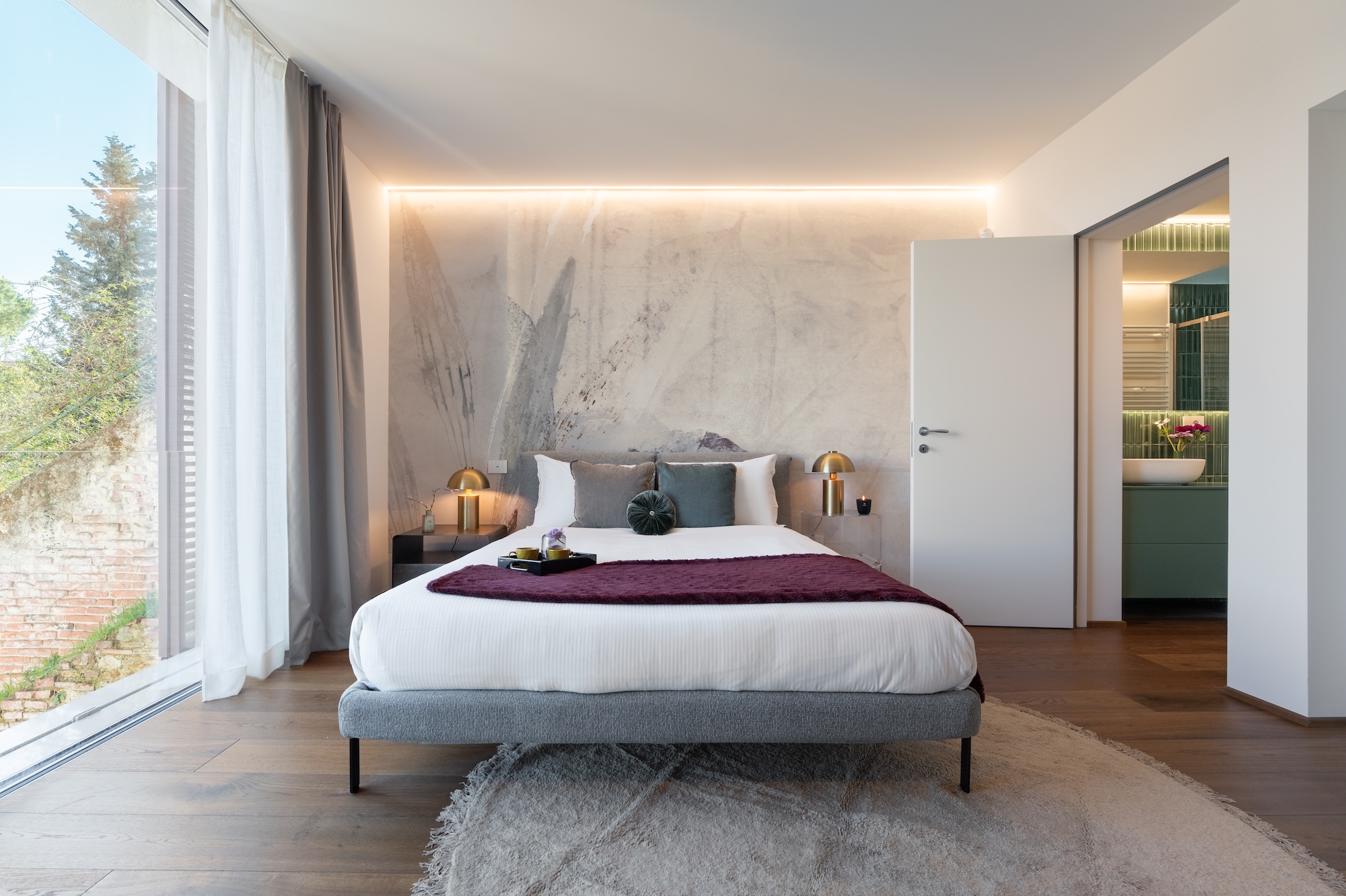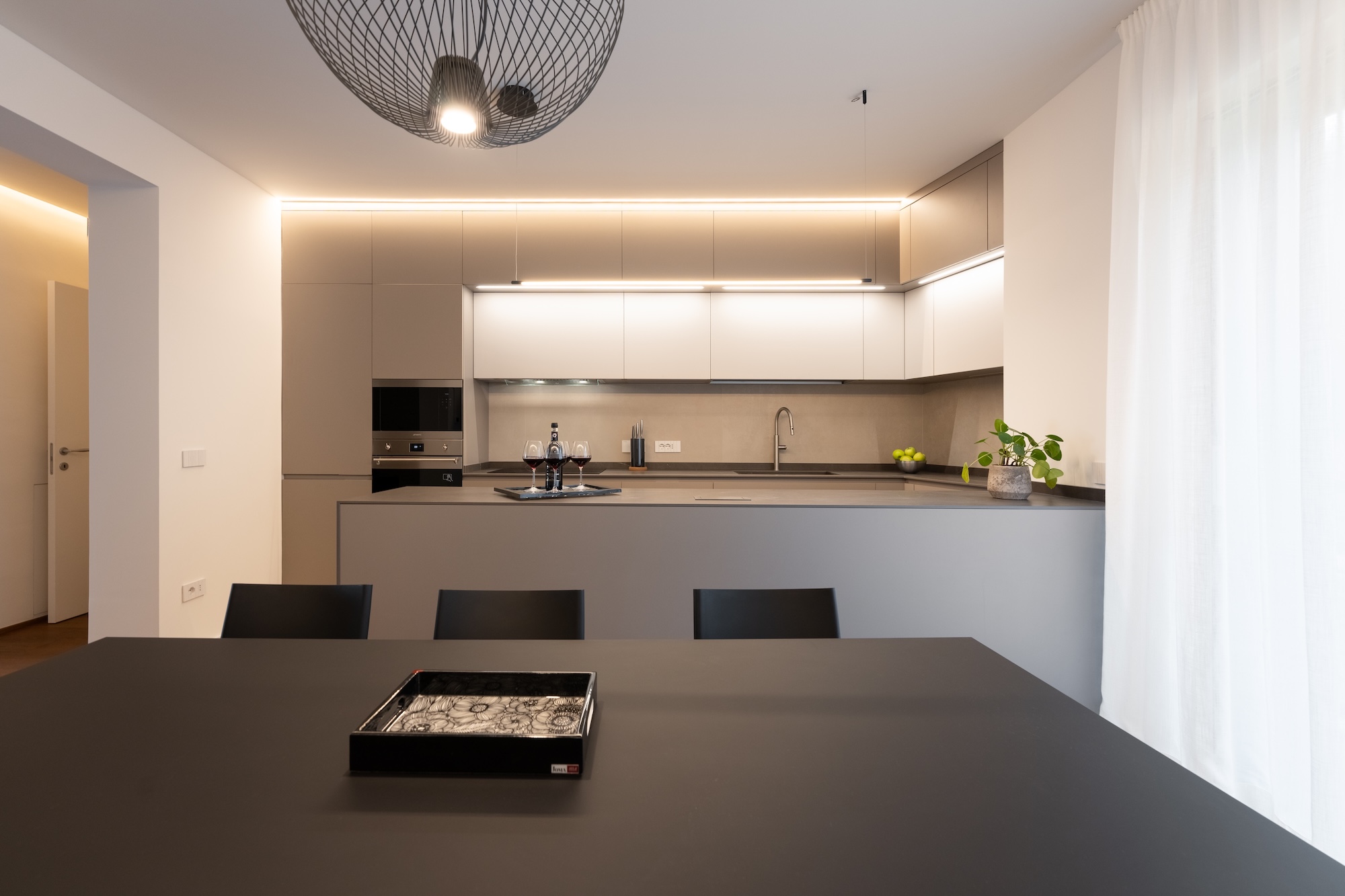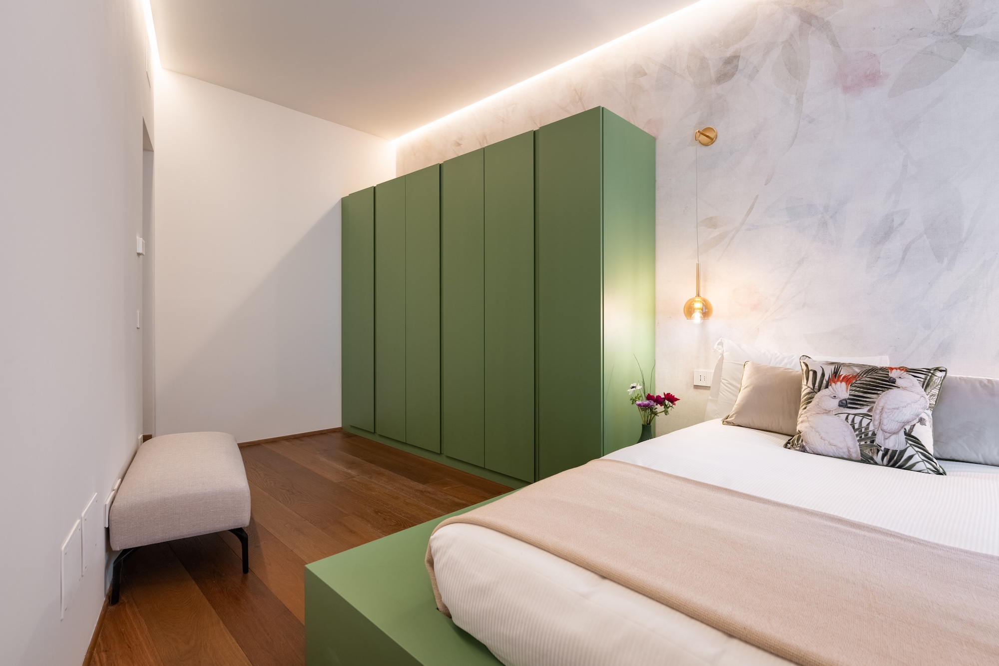 La scelta dei materiali e delle finiture di pregio contribuisce in modo determinante alla definizione del carattere dell’intervento: parquet in noce europeo, superfici in resina, gres porcellanato a basso spessore e carte da parati di alta qualità costruiscono un linguaggio materico elegante e contemporaneo, in equilibrio con l’elemento metallico centrale.