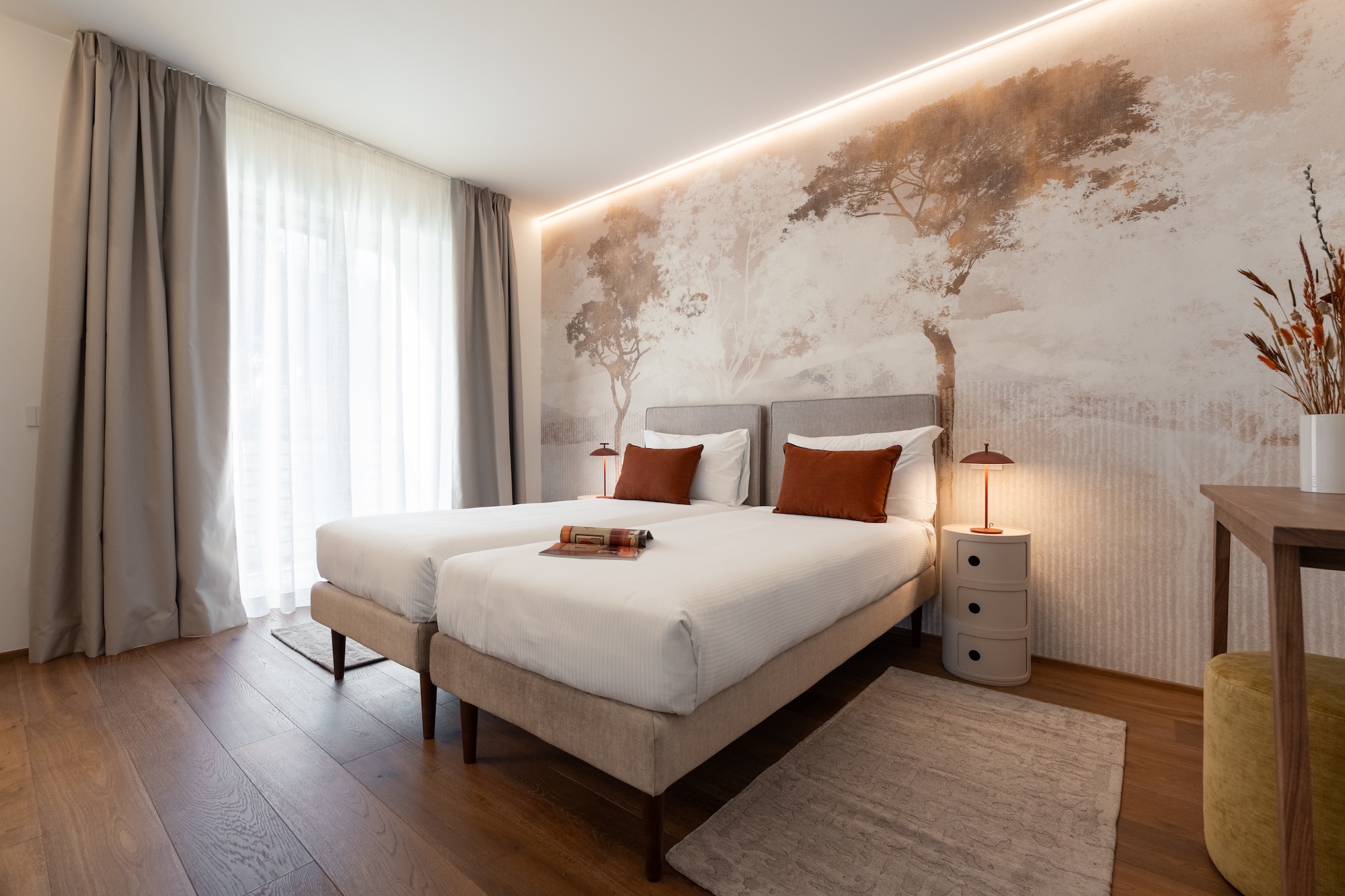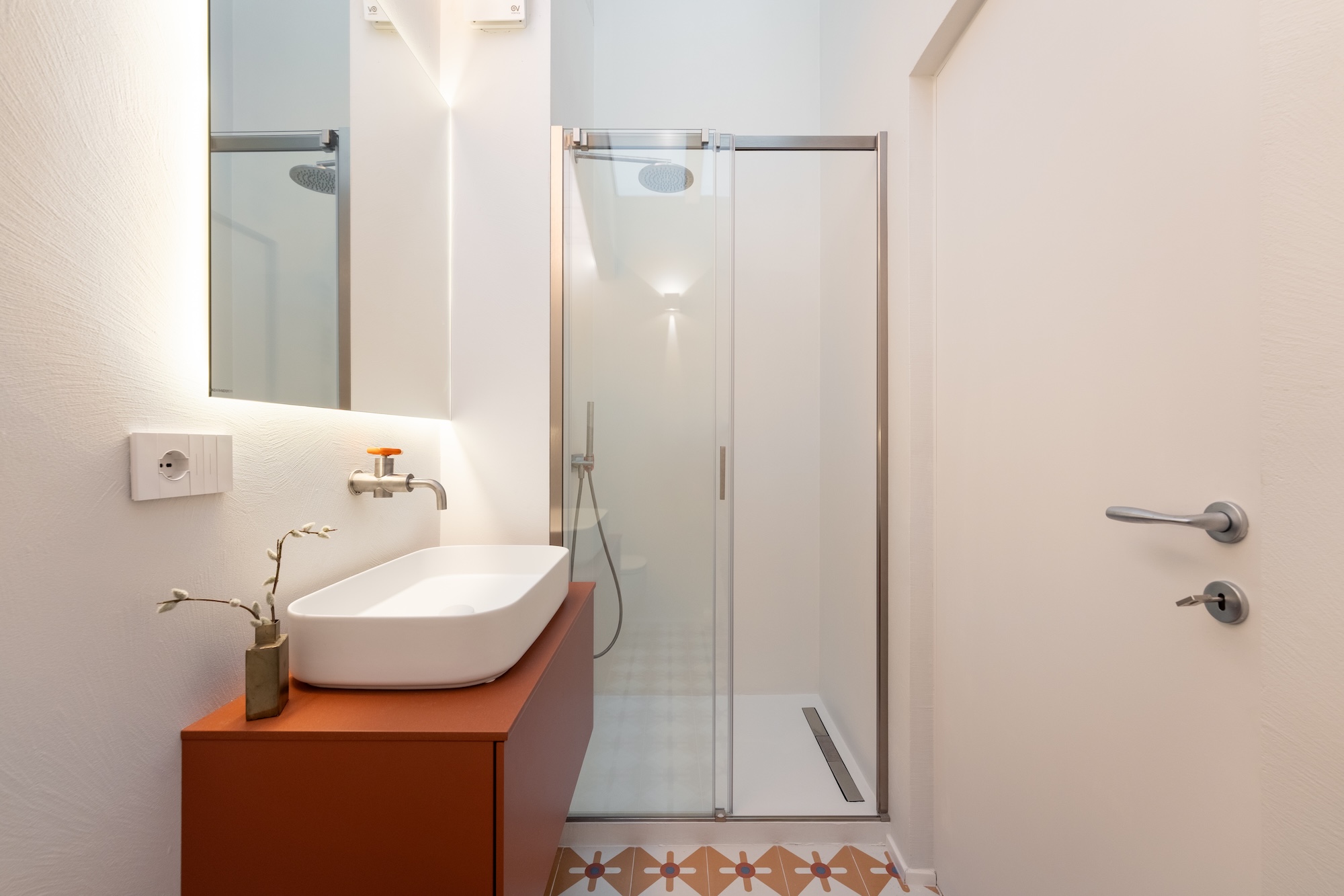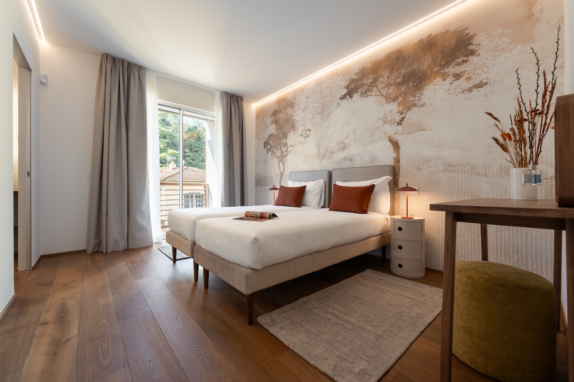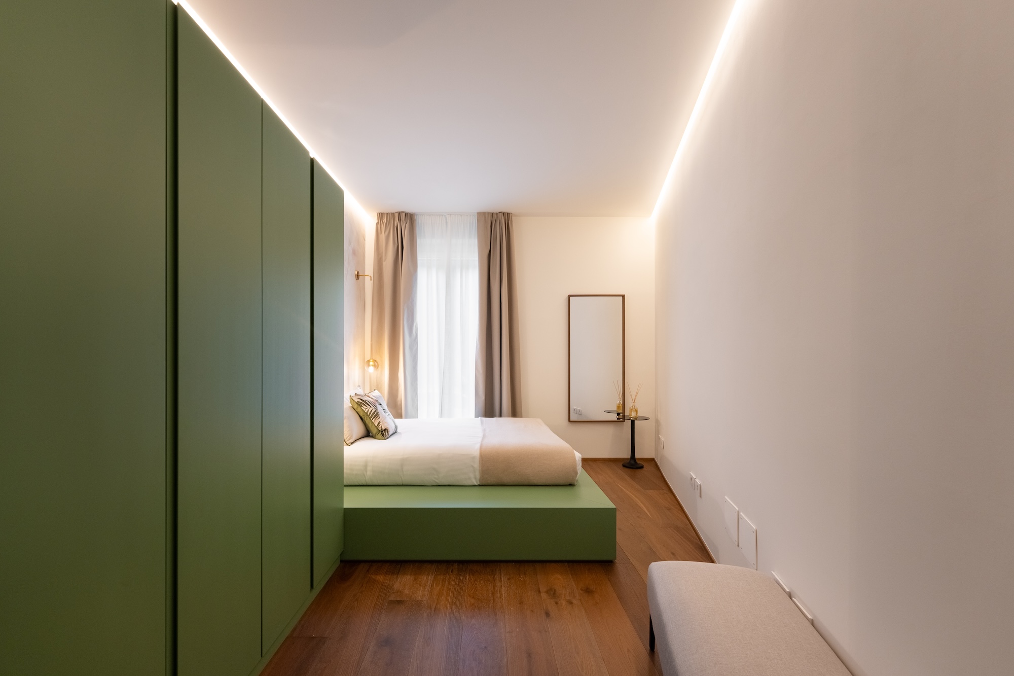 La scelta dei materiali e delle finiture di pregio contribuisce in modo determinante alla definizione del carattere dell’intervento: parquet in noce europeo, superfici in resina, gres porcellanato a basso spessore e carte da parati di alta qualità costruiscono un linguaggio materico elegante e contemporaneo, in equilibrio con l’elemento metallico centrale.