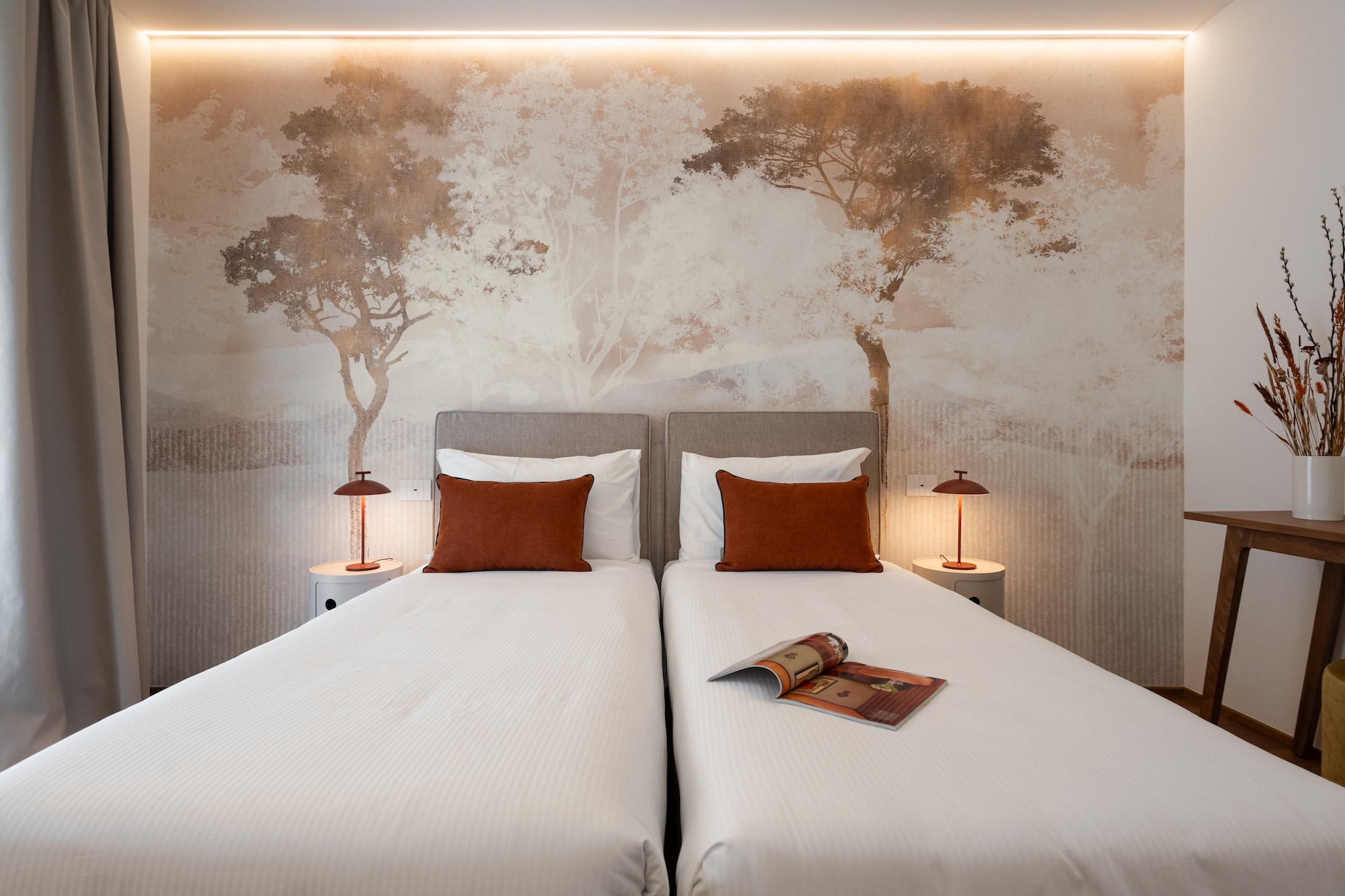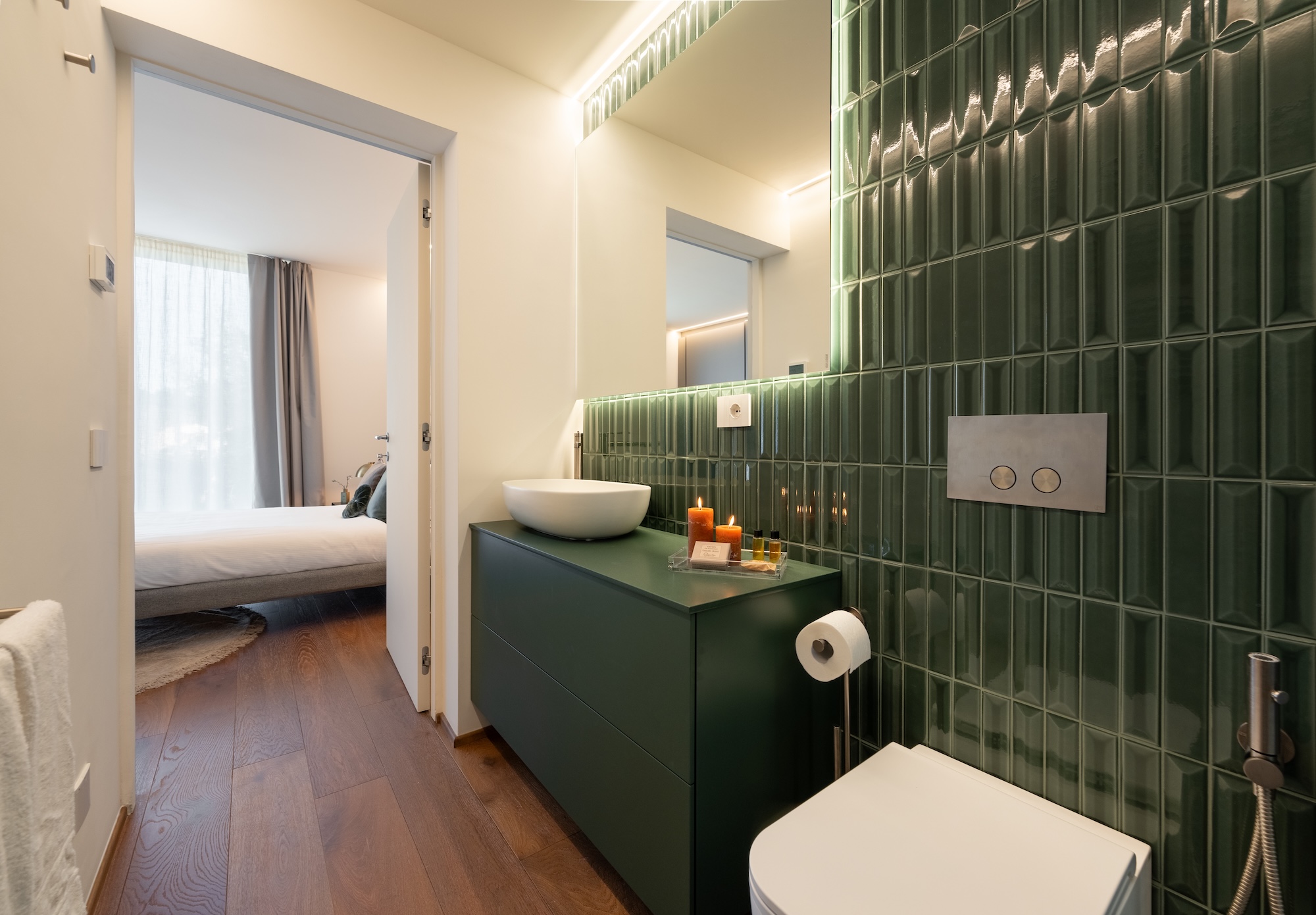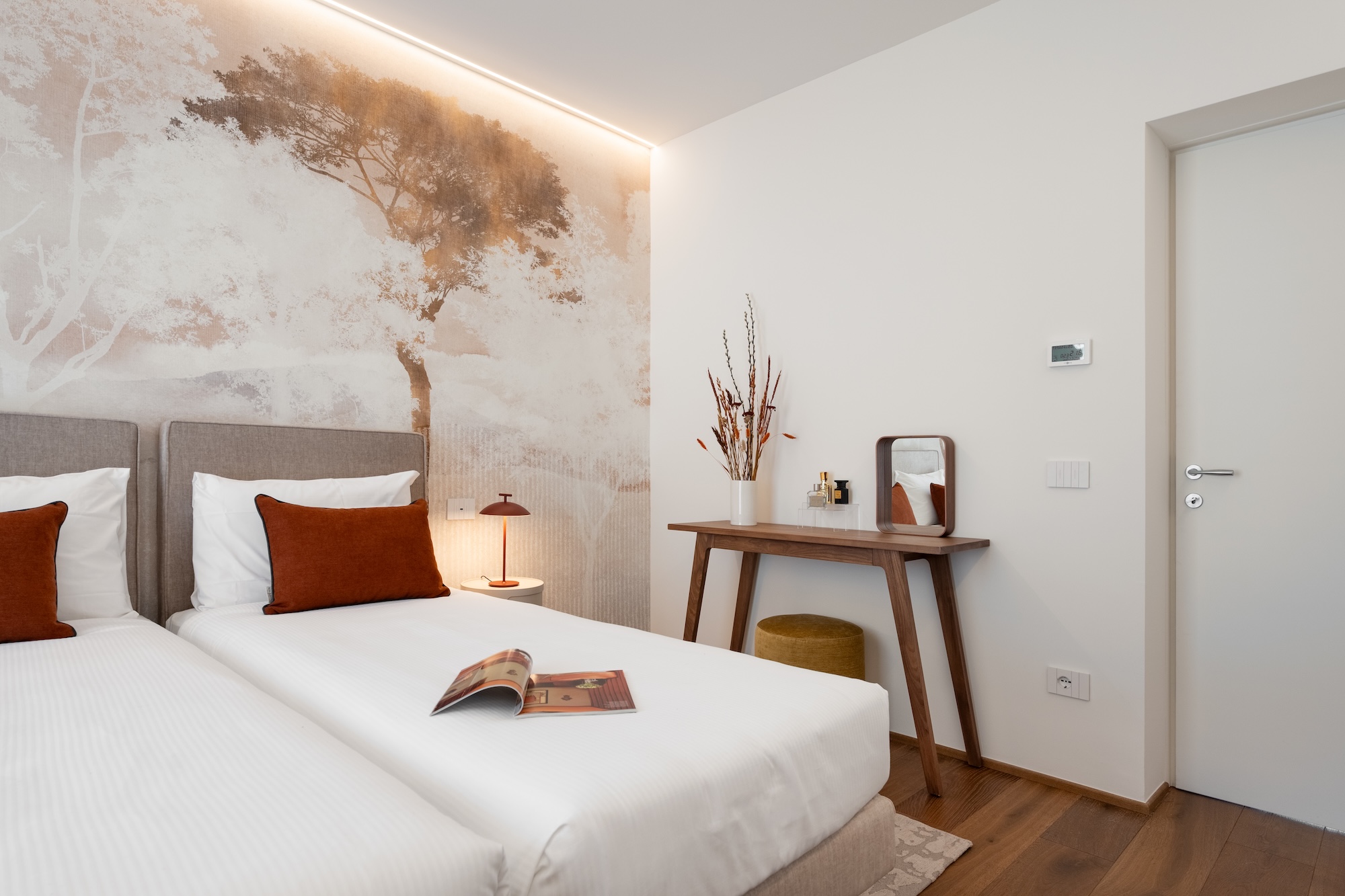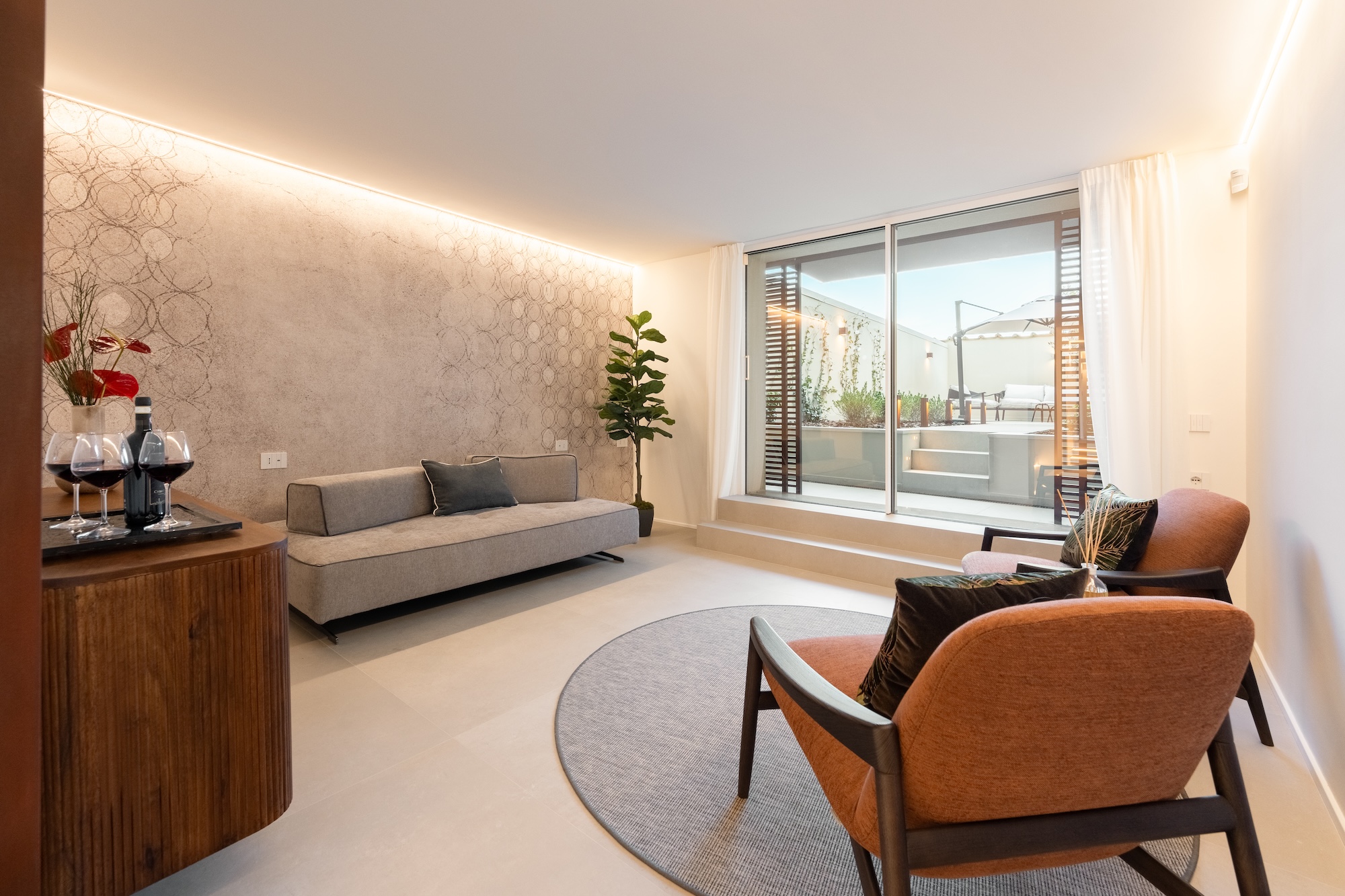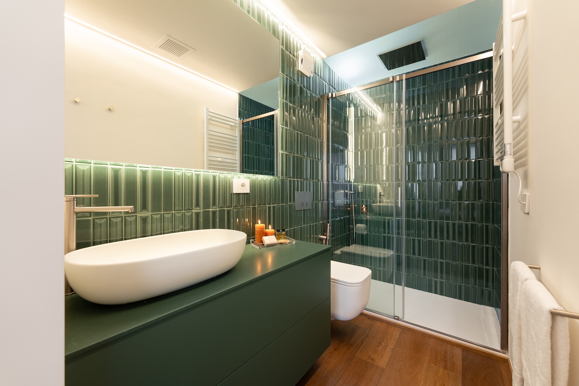 La scelta dei materiali e delle finiture di pregio contribuisce in modo determinante alla definizione del carattere dell’intervento: parquet in noce europeo, superfici in resina, gres porcellanato a basso spessore e carte da parati di alta qualità costruiscono un linguaggio materico elegante e contemporaneo, in equilibrio con l’elemento metallico centrale.