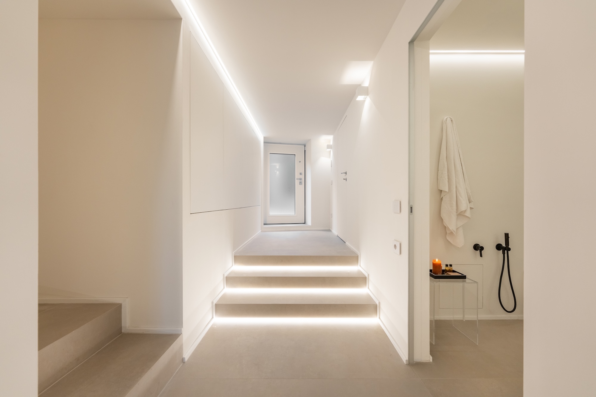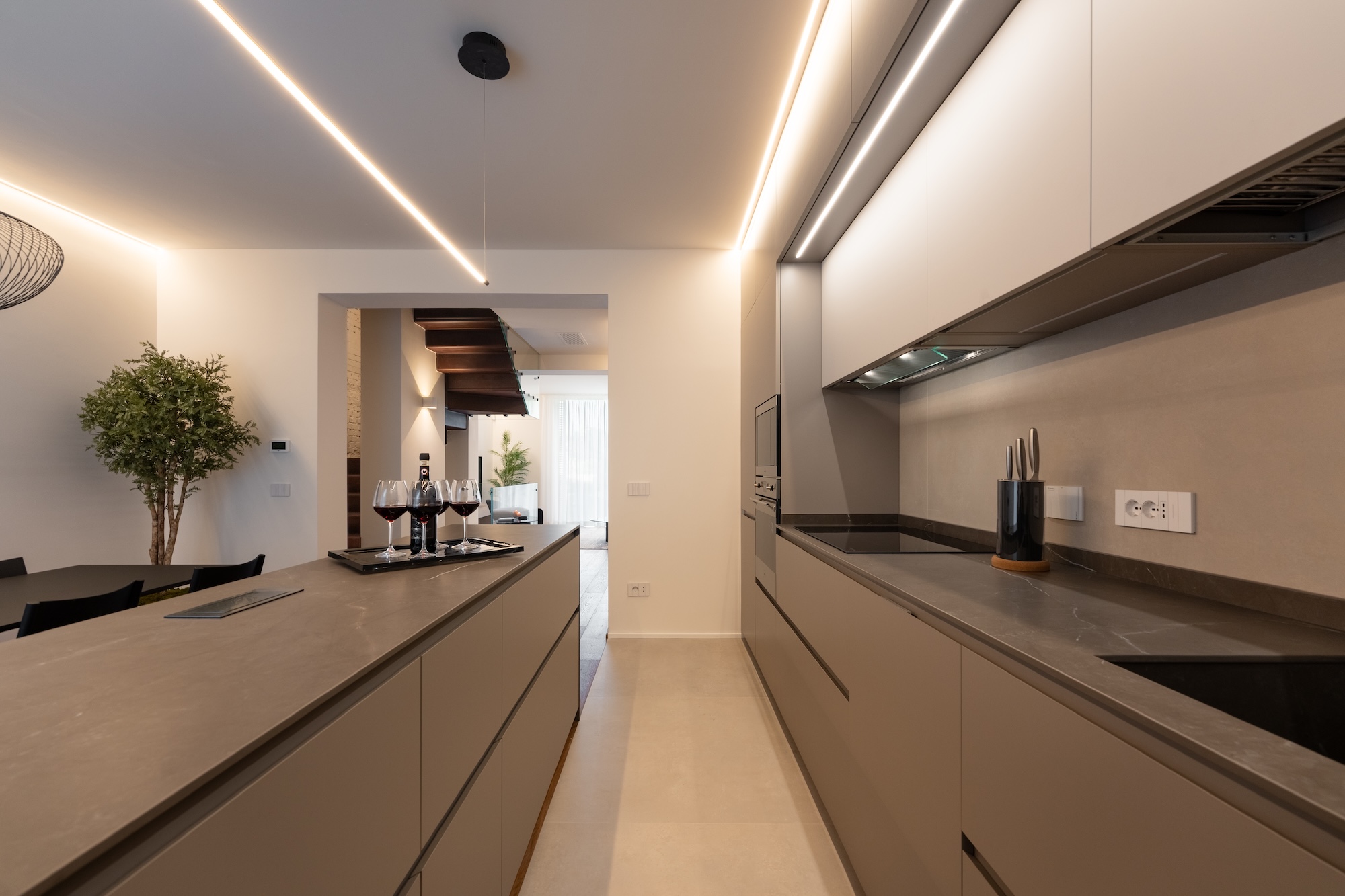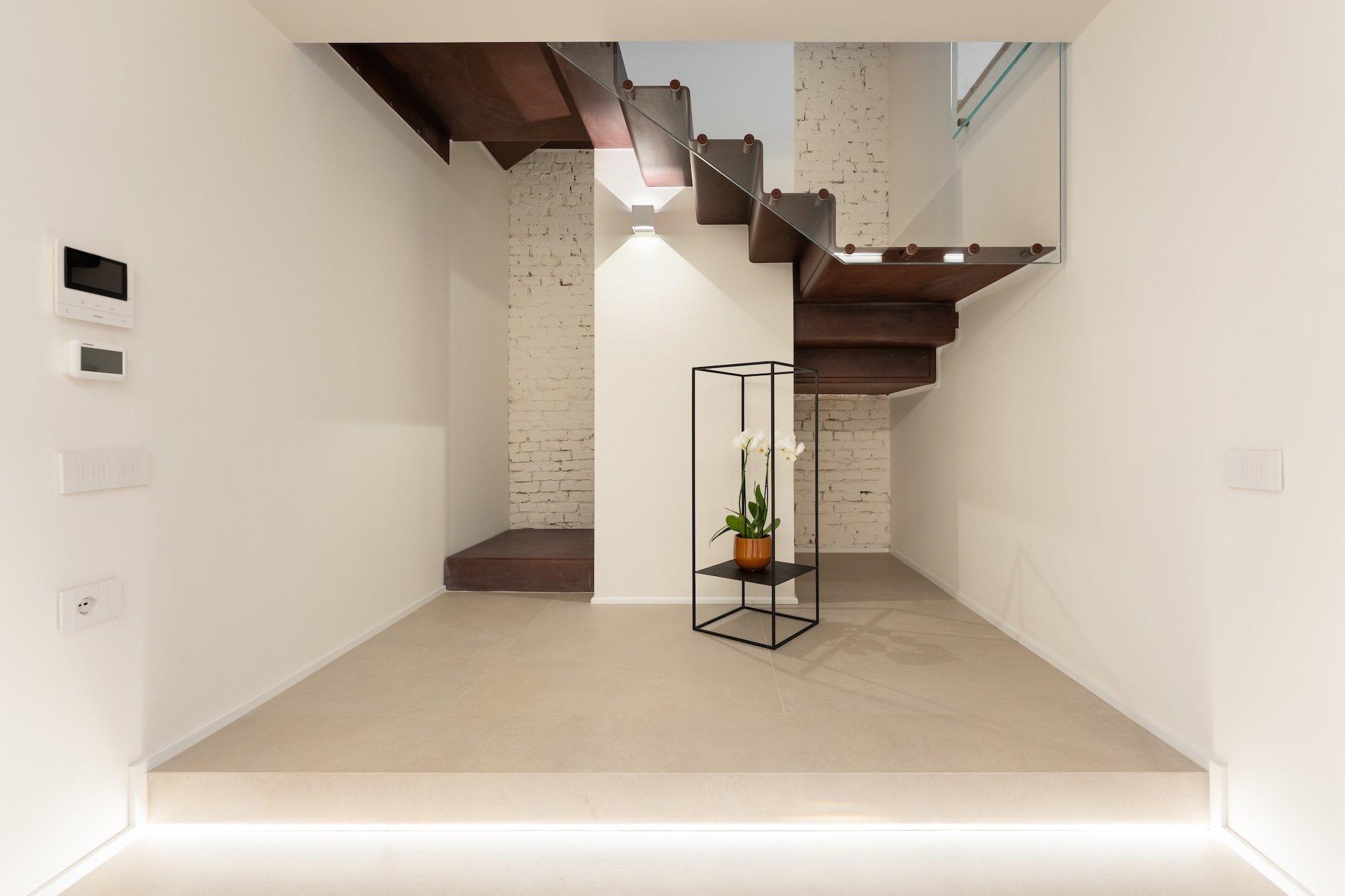 La colonna portante dell’intero progetto è rappresentata dal progetto su misura di una scala elicoidale a nastro squadrata in acciaio verniciato color corten, concepita come elemento architettonico e spaziale centrale. La scala connette verticalmente tutti i livelli dell’abitazione, garantendo una forte continuità verticale e diventando fulcro percettivo e distributivo dell’intervento.