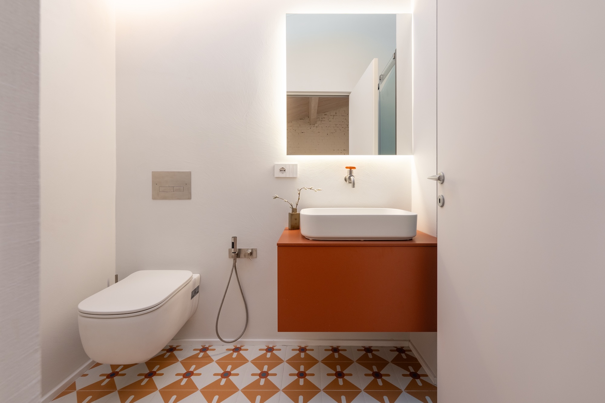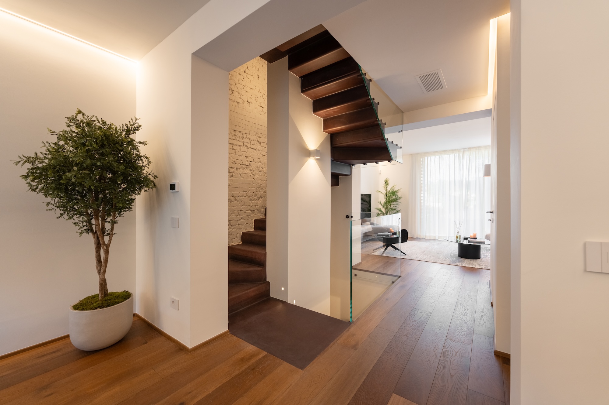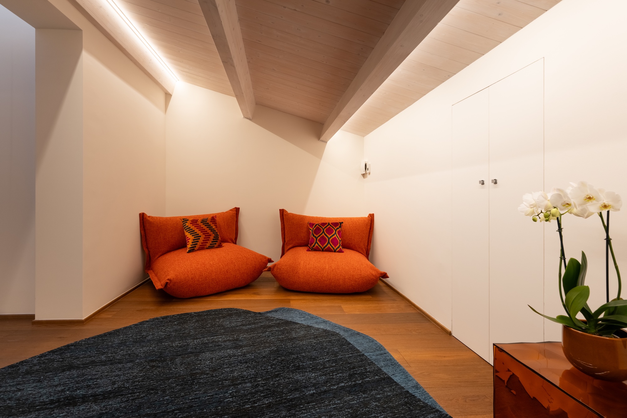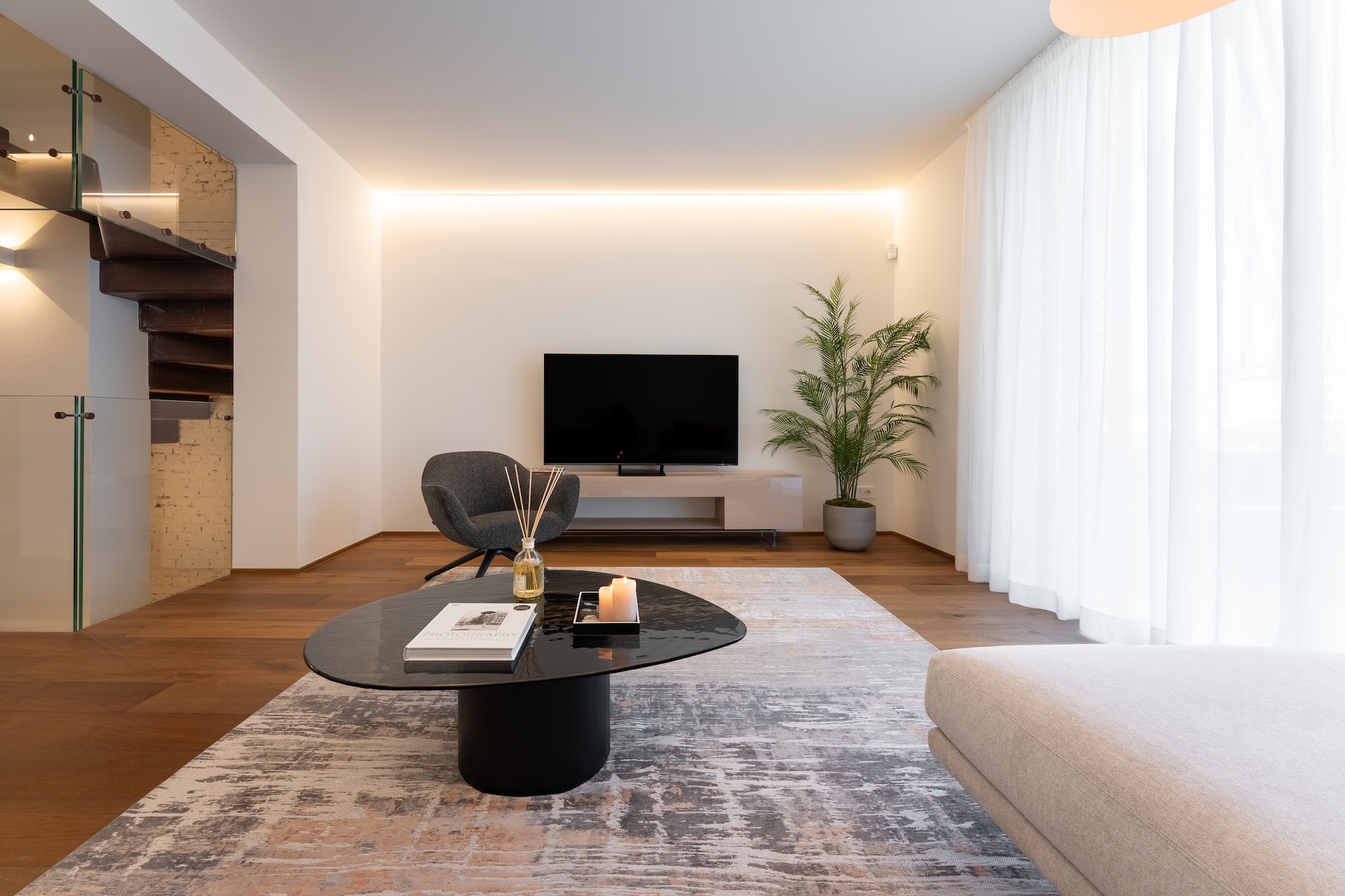 La colonna portante dell’intero progetto è rappresentata dal progetto su misura di una scala elicoidale a nastro squadrata in acciaio verniciato color corten, concepita come elemento architettonico e spaziale centrale. La scala connette verticalmente tutti i livelli dell’abitazione, garantendo una forte continuità verticale e diventando fulcro percettivo e distributivo dell’intervento.
