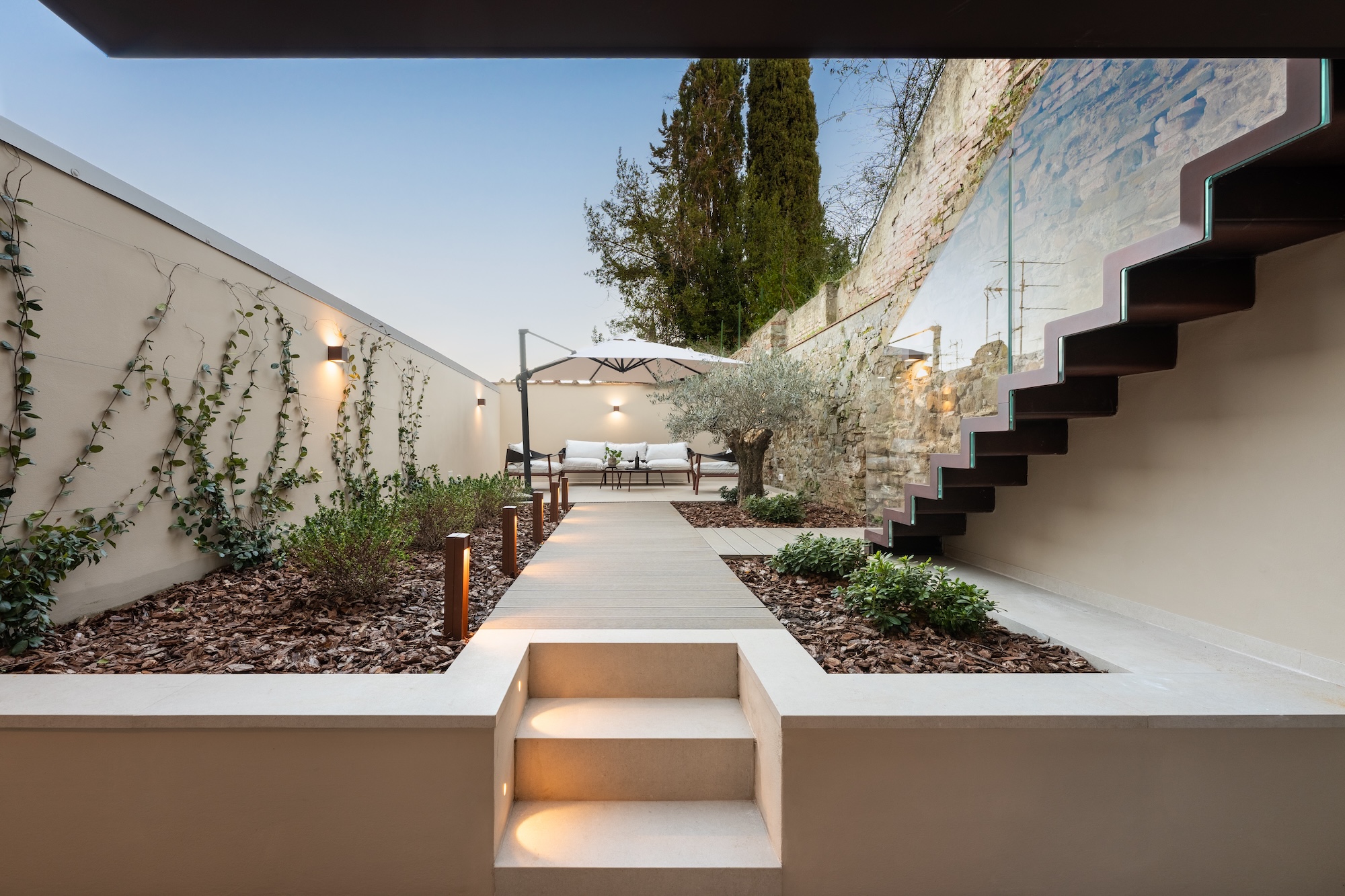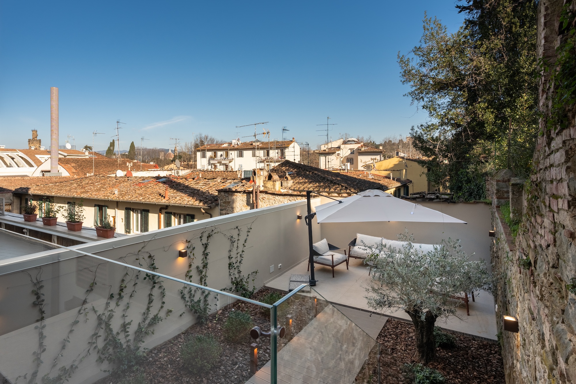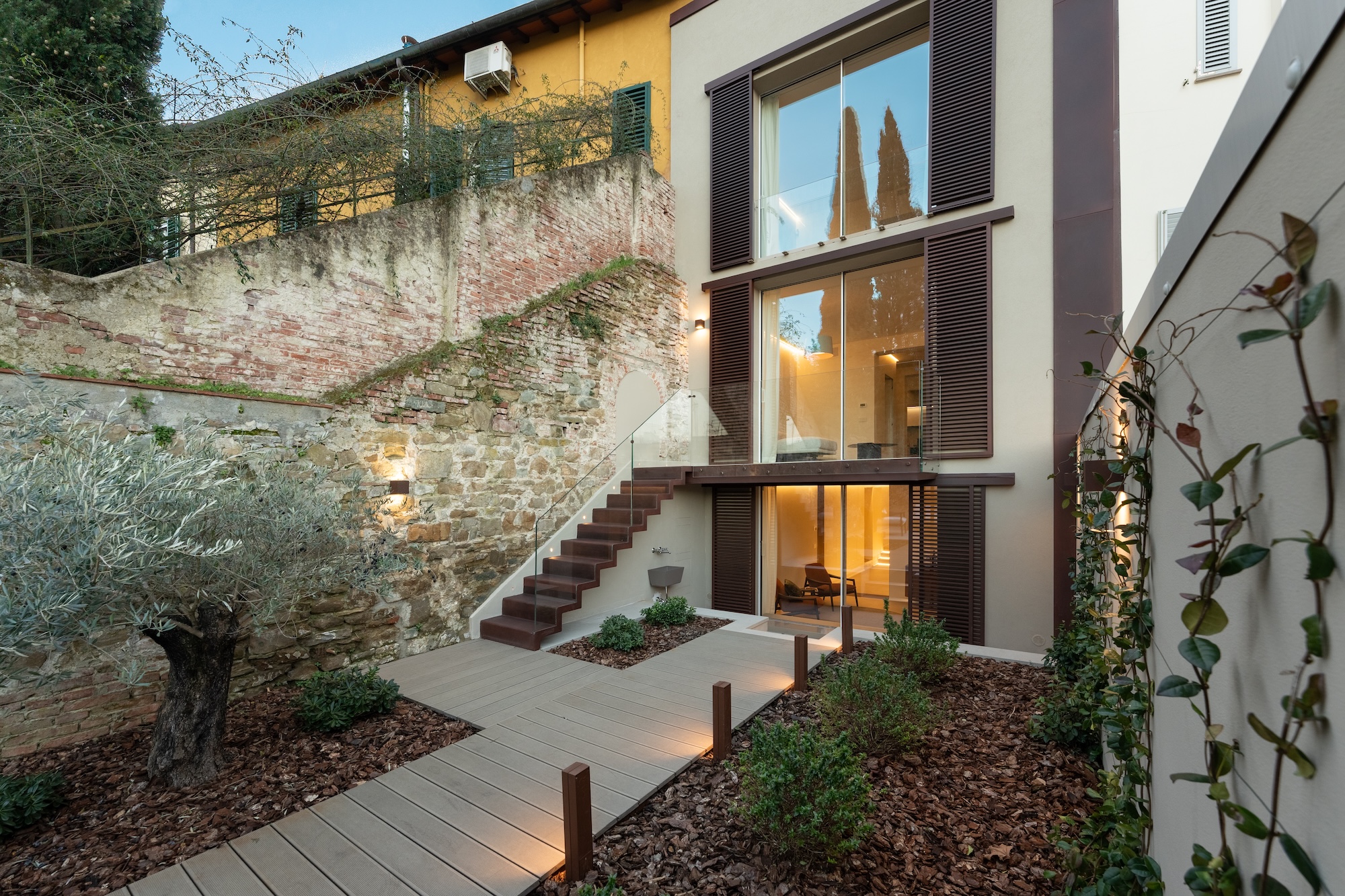 Anche le facciate sono state completamente riprogettate in chiave contemporanea, mantenendo un dialogo misurato con l’edificato storico circostante. Sul fronte sud/est sono state realizzate ampie aperture per incrementare gli apporti solari gratuiti e migliorare la qualità della luce naturale all’interno degli ambienti. Il controllo dell’irraggiamento è affidato a pannelli scorrevoli a lamelle orizzontali (brise-soleil), concepiti come elementi architettonici e bioclimatici, capaci di richiamare in chiave astratta il disegno e la funzione delle persiane fiorentine.
