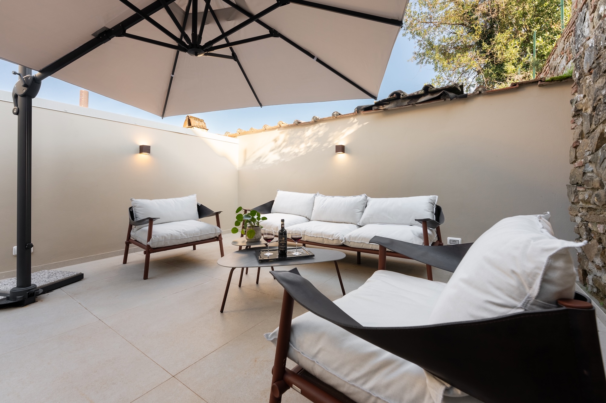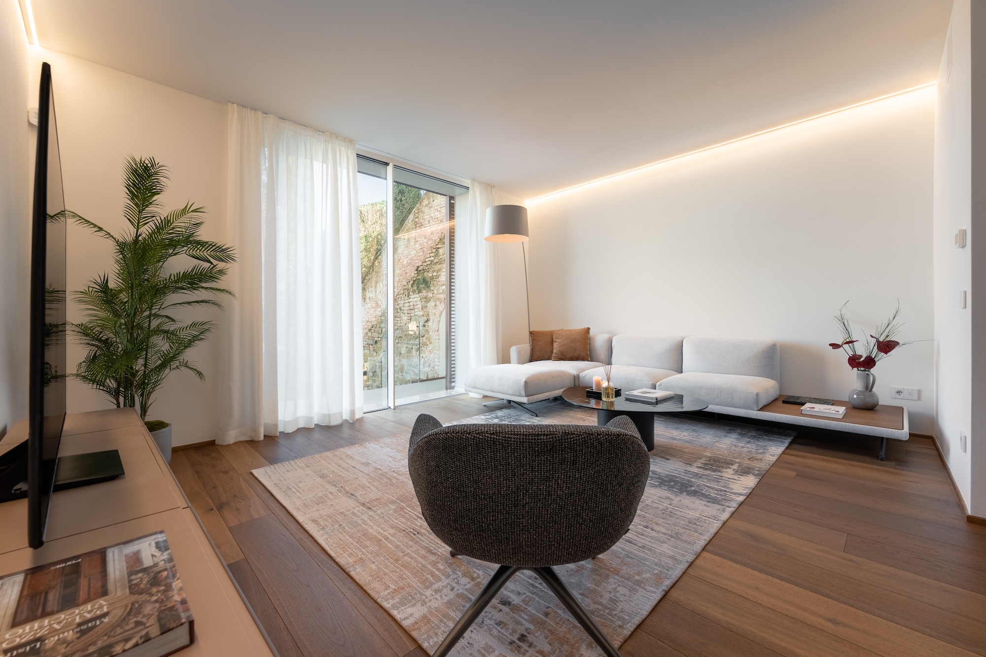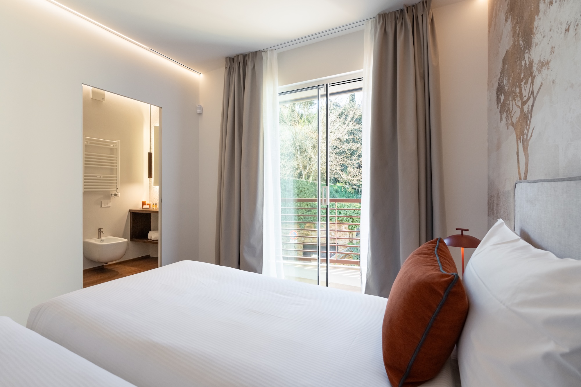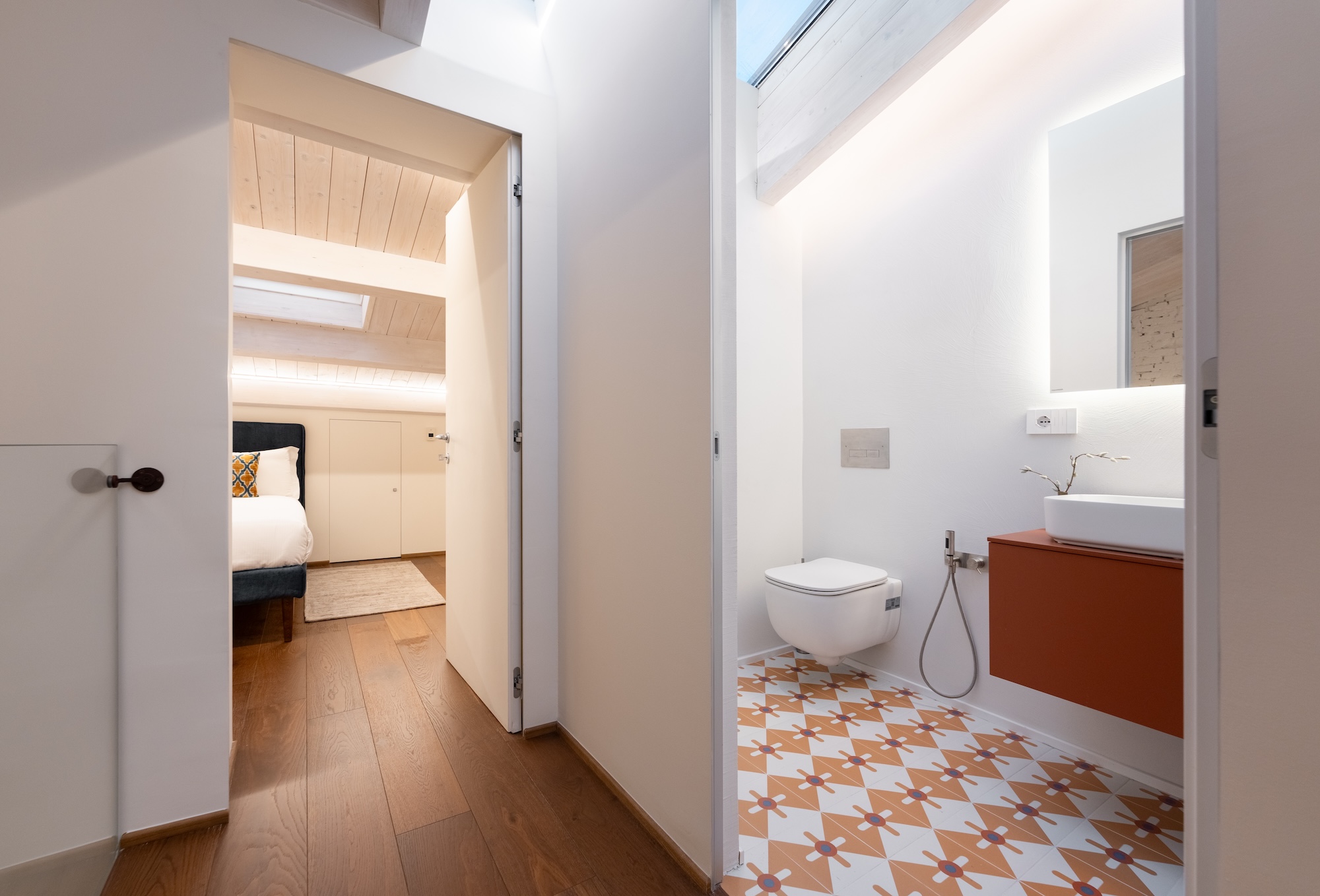 Anche le facciate sono state completamente riprogettate in chiave contemporanea, mantenendo un dialogo misurato con l’edificato storico circostante. Sul fronte sud/est sono state realizzate ampie aperture per incrementare gli apporti solari gratuiti e migliorare la qualità della luce naturale all’interno degli ambienti. Il controllo dell’irraggiamento è affidato a pannelli scorrevoli a lamelle orizzontali (brise-soleil), concepiti come elementi architettonici e bioclimatici, capaci di richiamare in chiave astratta il disegno e la funzione delle persiane fiorentine.