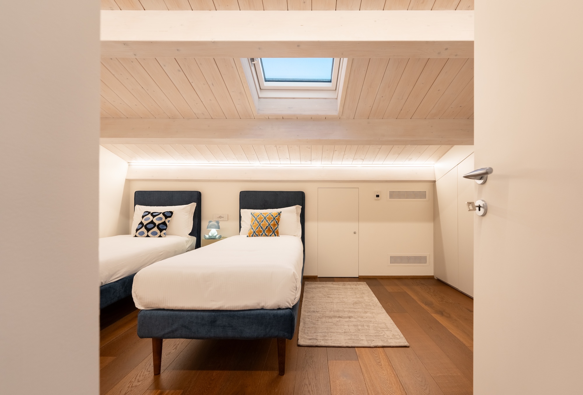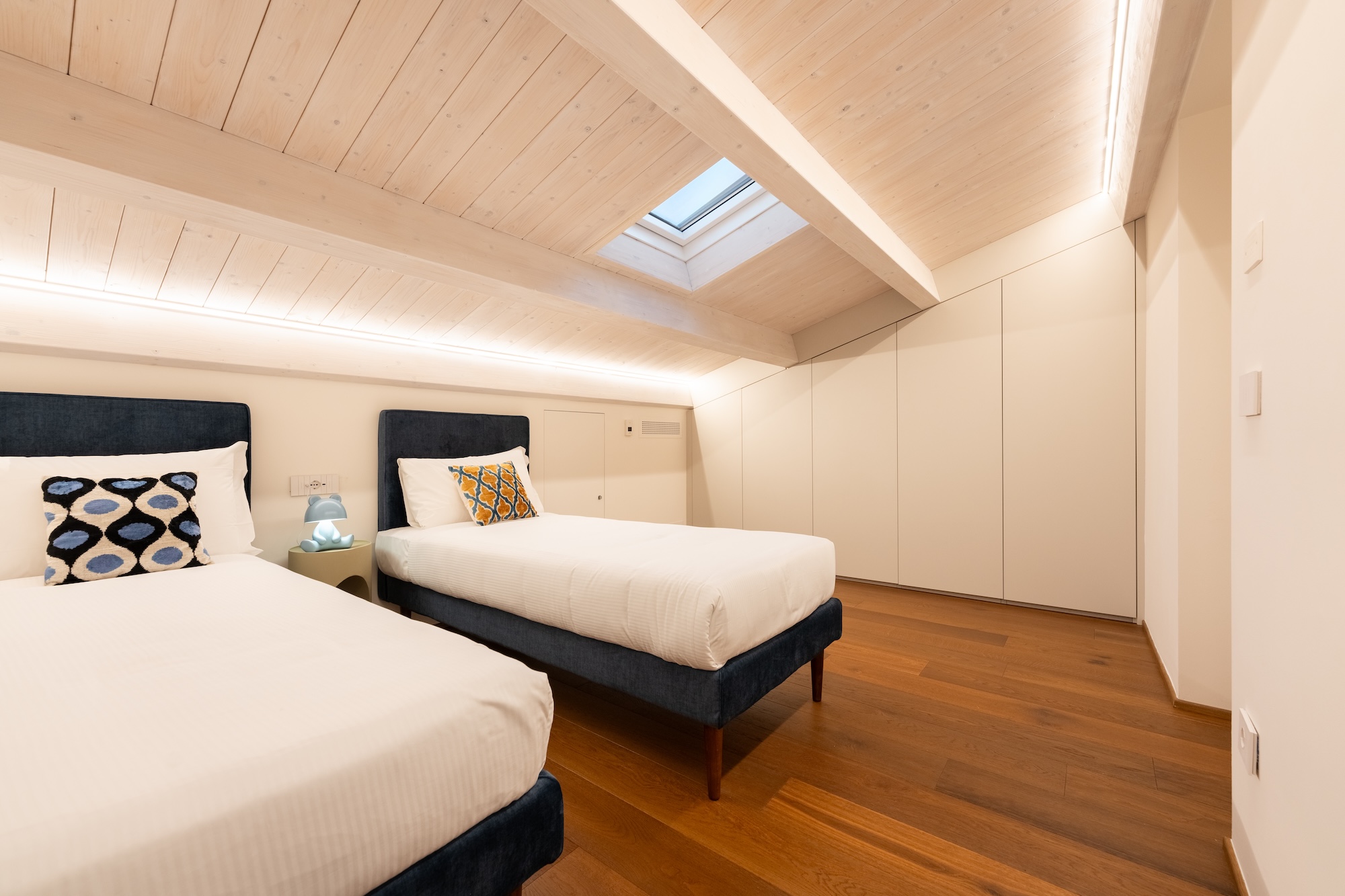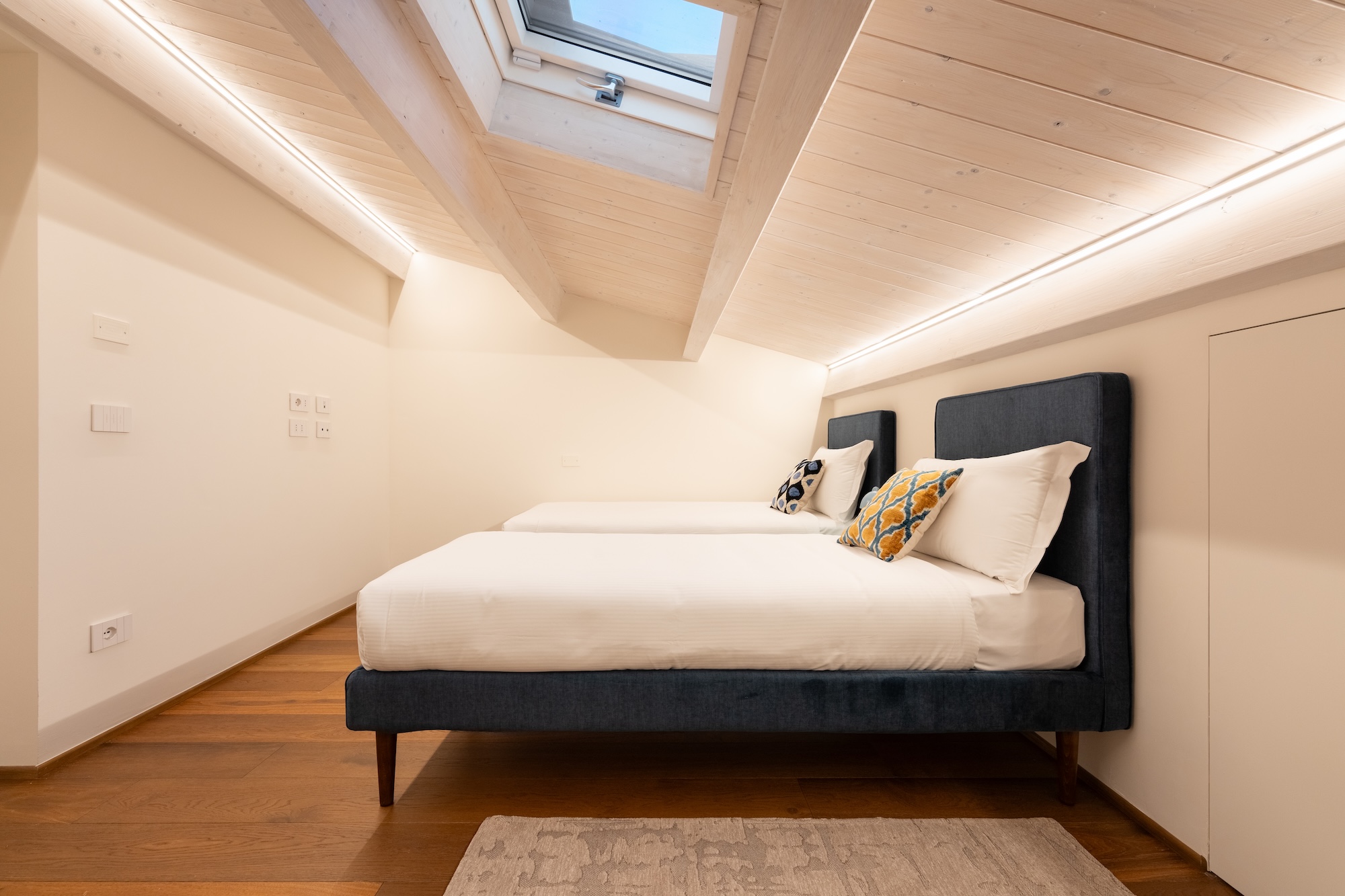 Ai piani secondo e terzo si sviluppa la zona notte, composta da quattro camere da letto, di cui due con bagno privato, organizzate per garantire comfort, privacy e continuità distributiva. L’ultimo piano è caratterizzato dalla presenza di un ampio lucernario, opportunamente schermato per limitare l’irraggiamento diretto nei mesi estivi. Questo elemento contribuisce in modo significativo a migliorare l’illuminazione naturale (zenitale) degli spazi interni e a stabilire un asse visivo costante con il cielo, ampliando la percezione spaziale e la qualità ambientale dell’abitazione.