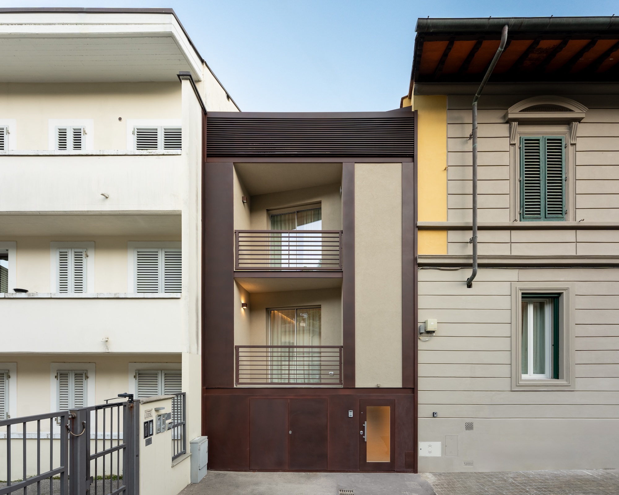 Lo stesso materiale e la stessa cromia corten della scala sono stati utilizzati per alcuni elementi di facciata, rafforzando il collegamento materico e concettuale tra interno ed esterno.