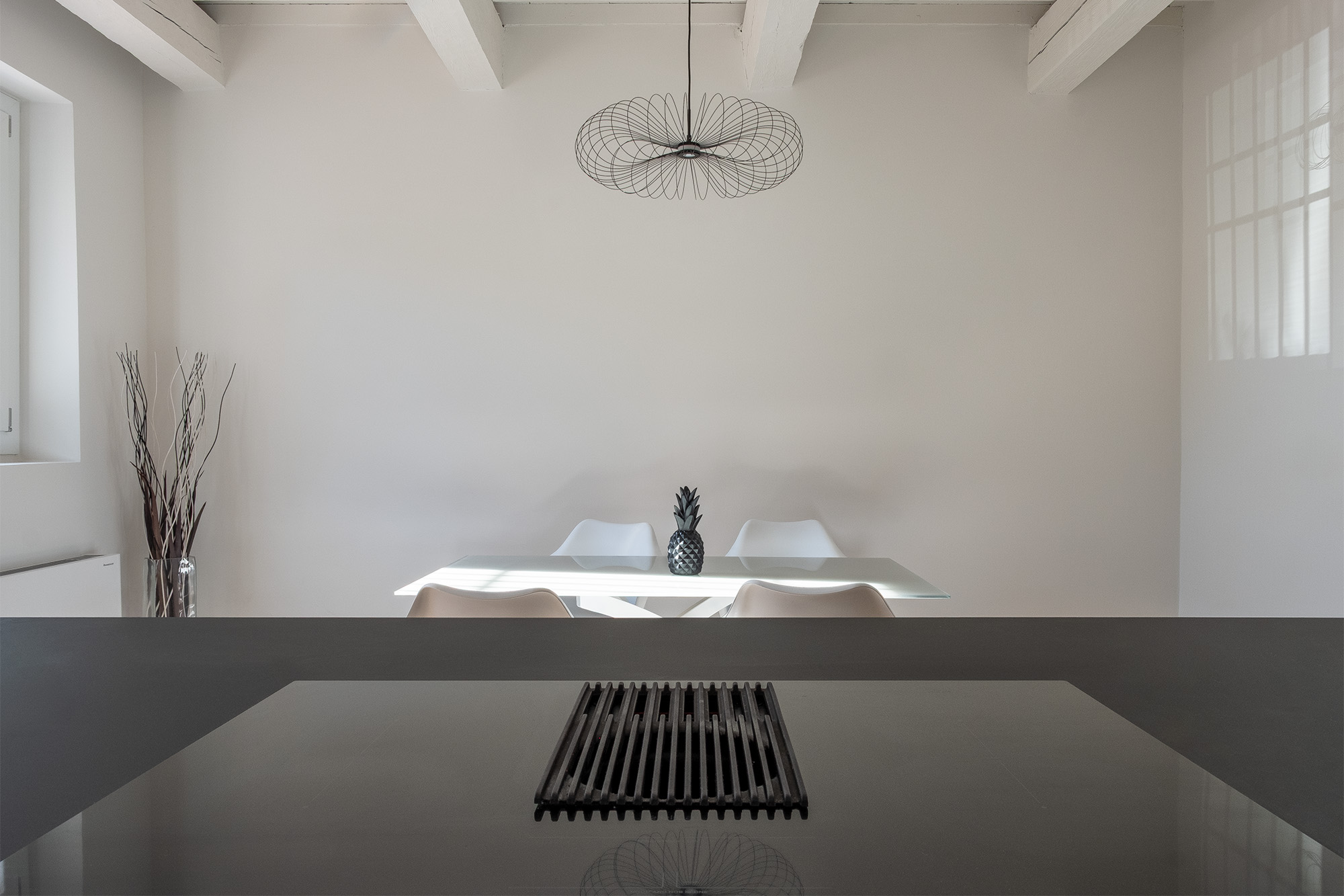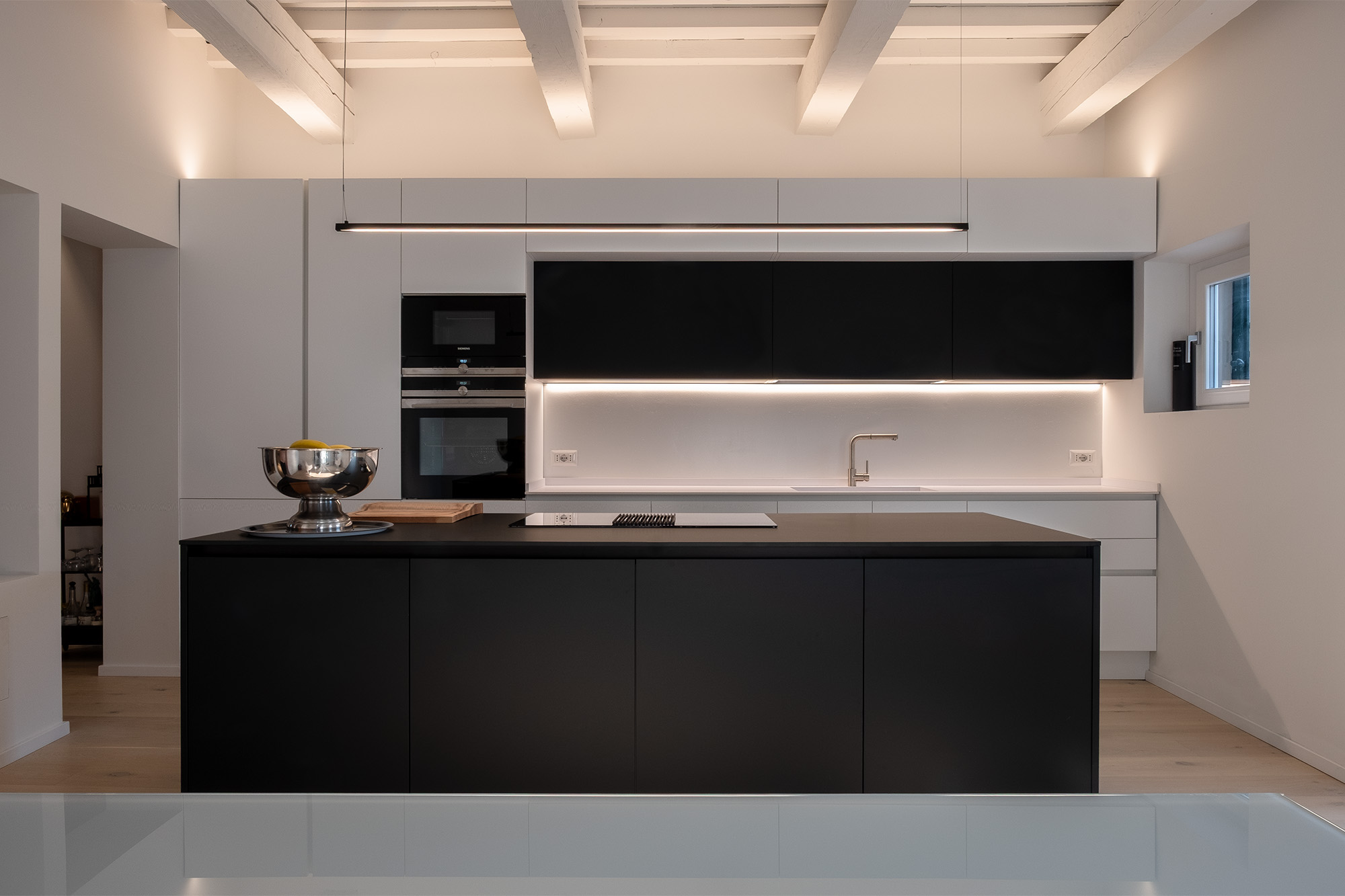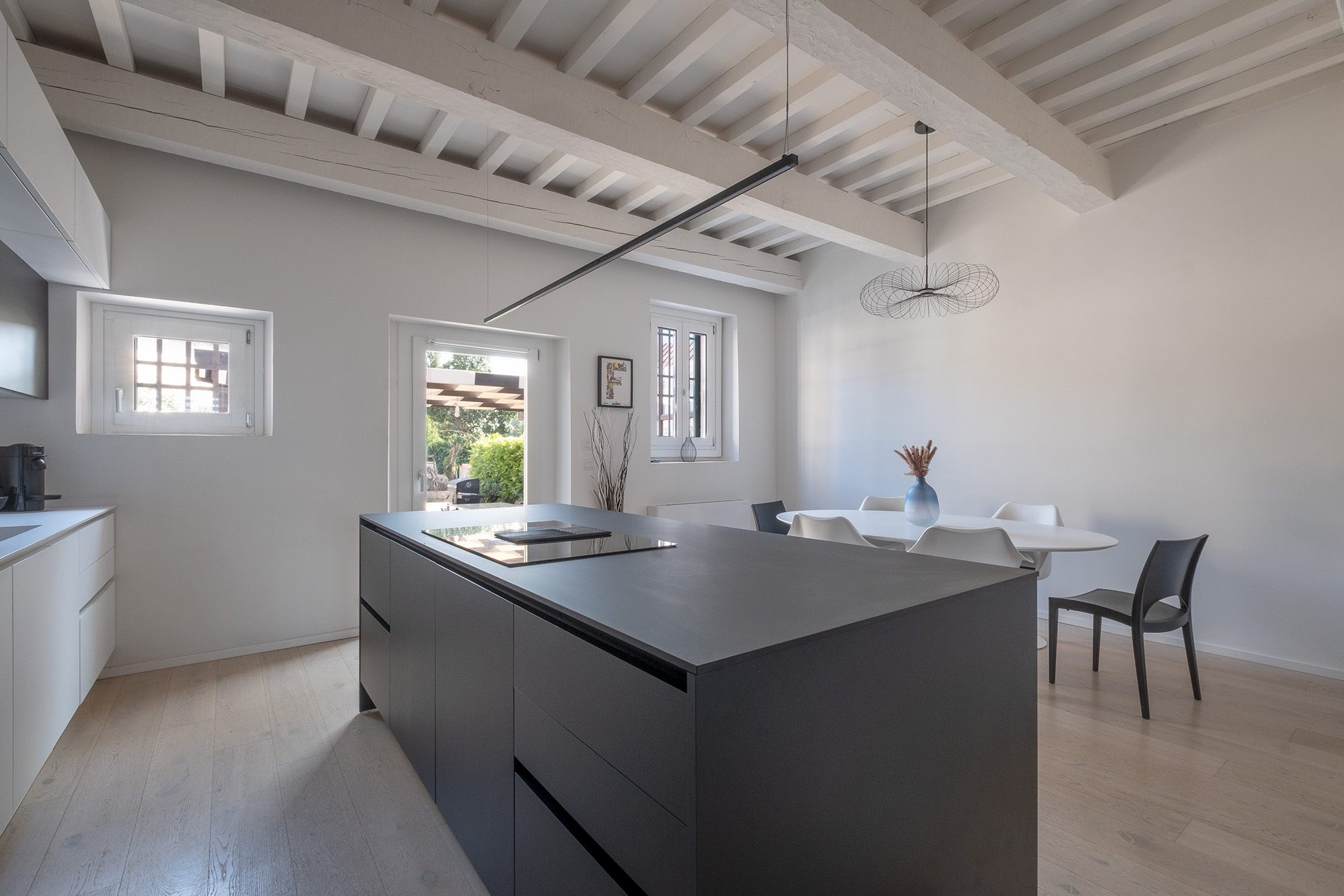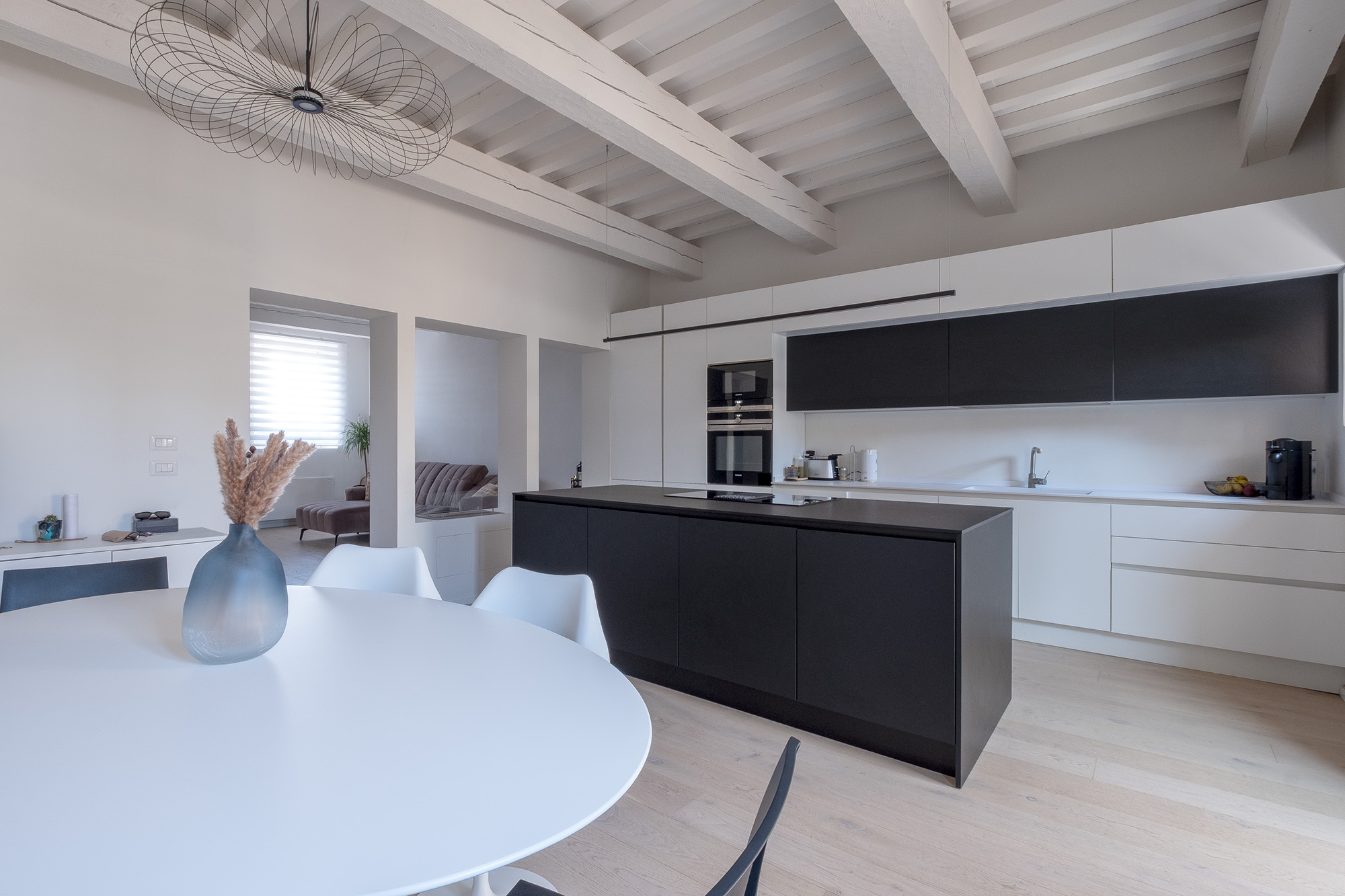 La zona giorno si sviluppa come un open space luminoso, che integra cucina e sala da pranzo in modo armonioso. Gli ambienti sono valorizzati da soffitti con travi a vista, lasciate leggibili ma reinterpretate in chiave contemporanea attraverso la finitura bianca, capace di amplificare la percezione dello spazio e della luce naturale. La cucina, dal disegno lineare ed essenziale, è caratterizzata da arredi bianchi opachi accostati a elementi scuri a contrasto e da una grande isola centrale dal forte valore funzionale e compositivo. Gli elettrodomestici sono completamente integrati, contribuendo a un’immagine ordinata e pulita. La zona pranzo, arredata con elementi dal design moderno, dialoga con i pavimenti in legno chiaro (rovere spazzolato naturale decapato), che conferiscono calore e continuità agli spazi. L’illuminazione artificiale è studiata per accompagnare e valorizzare le diverse funzioni degli ambienti.