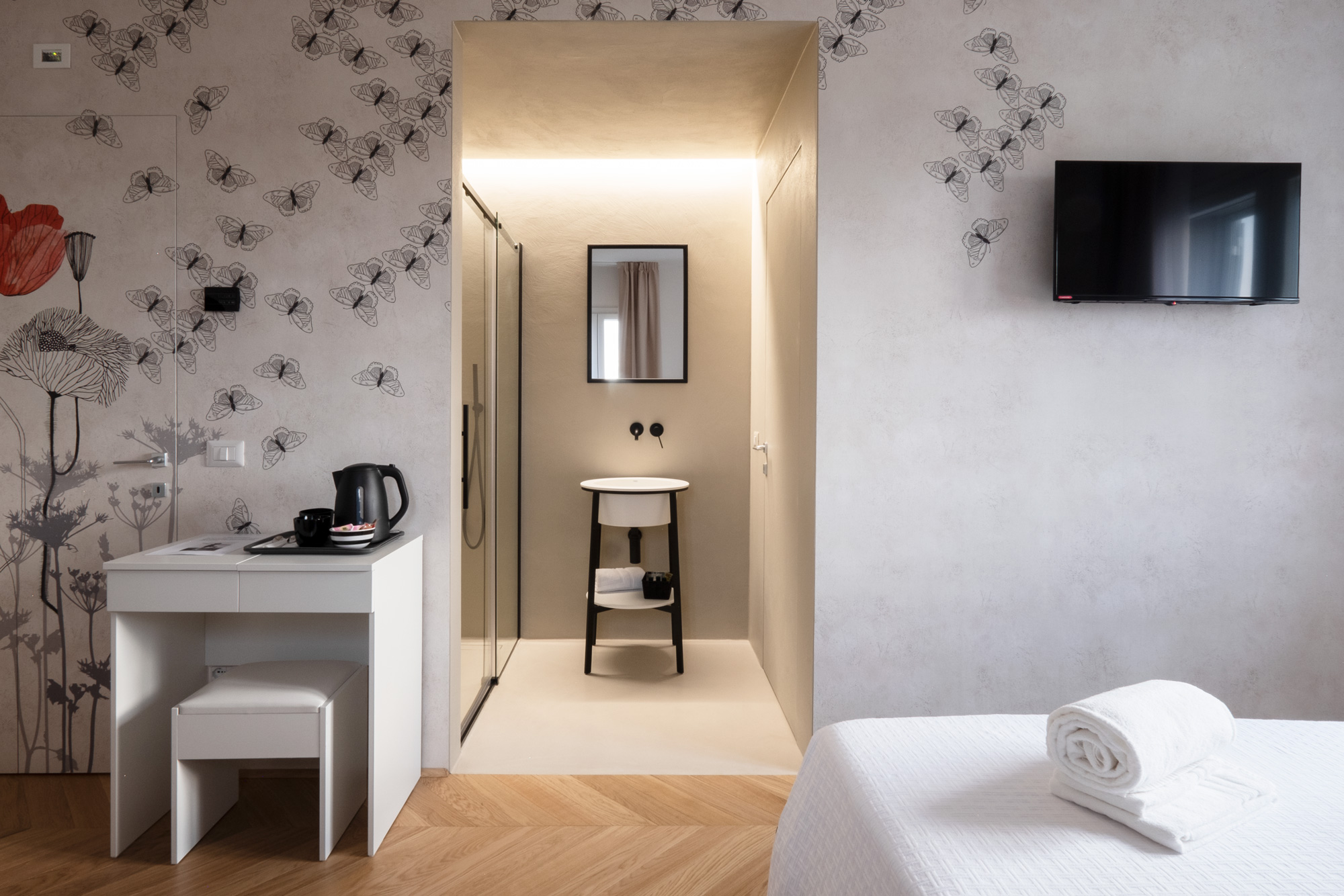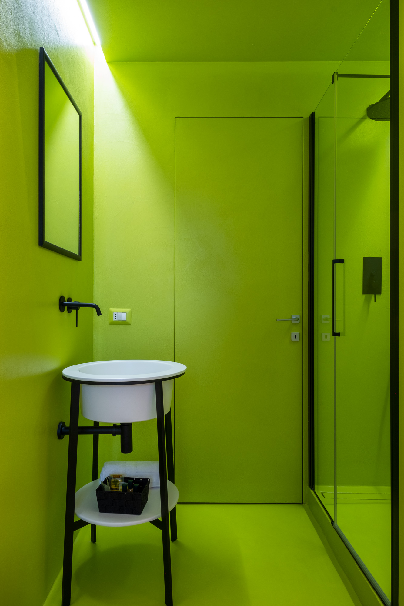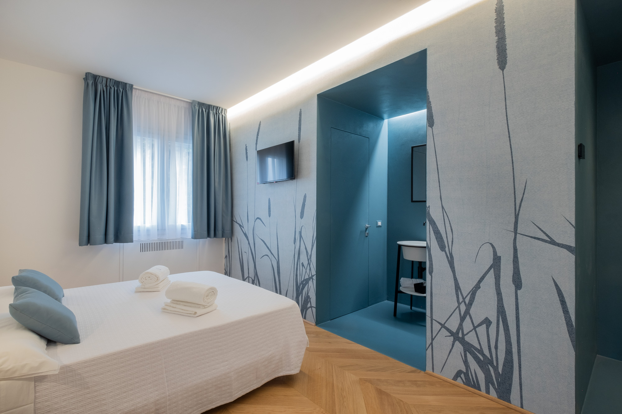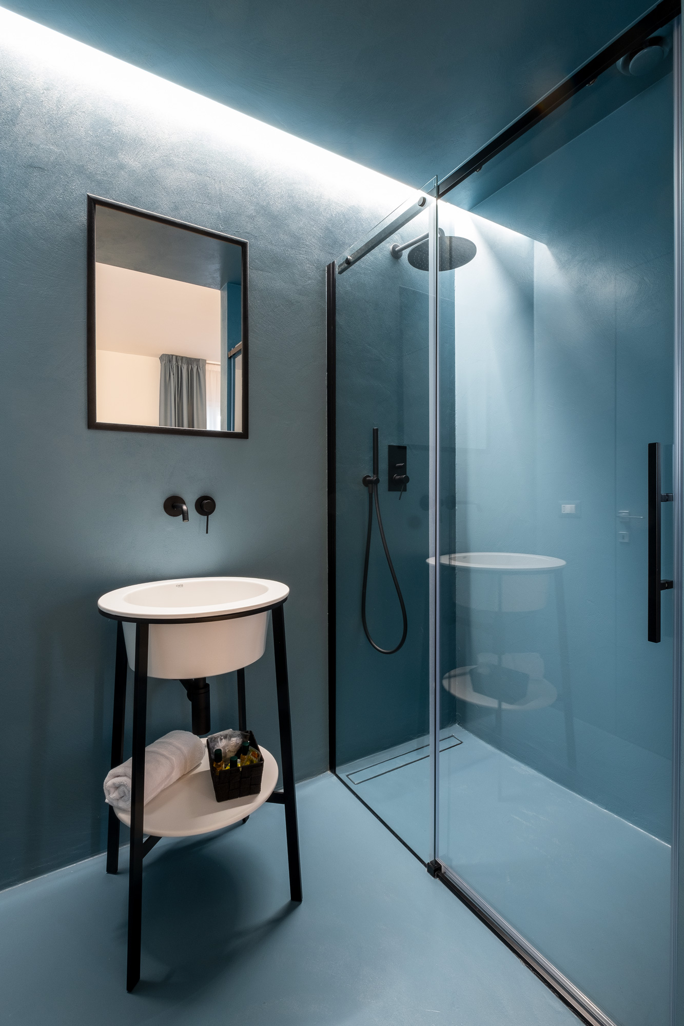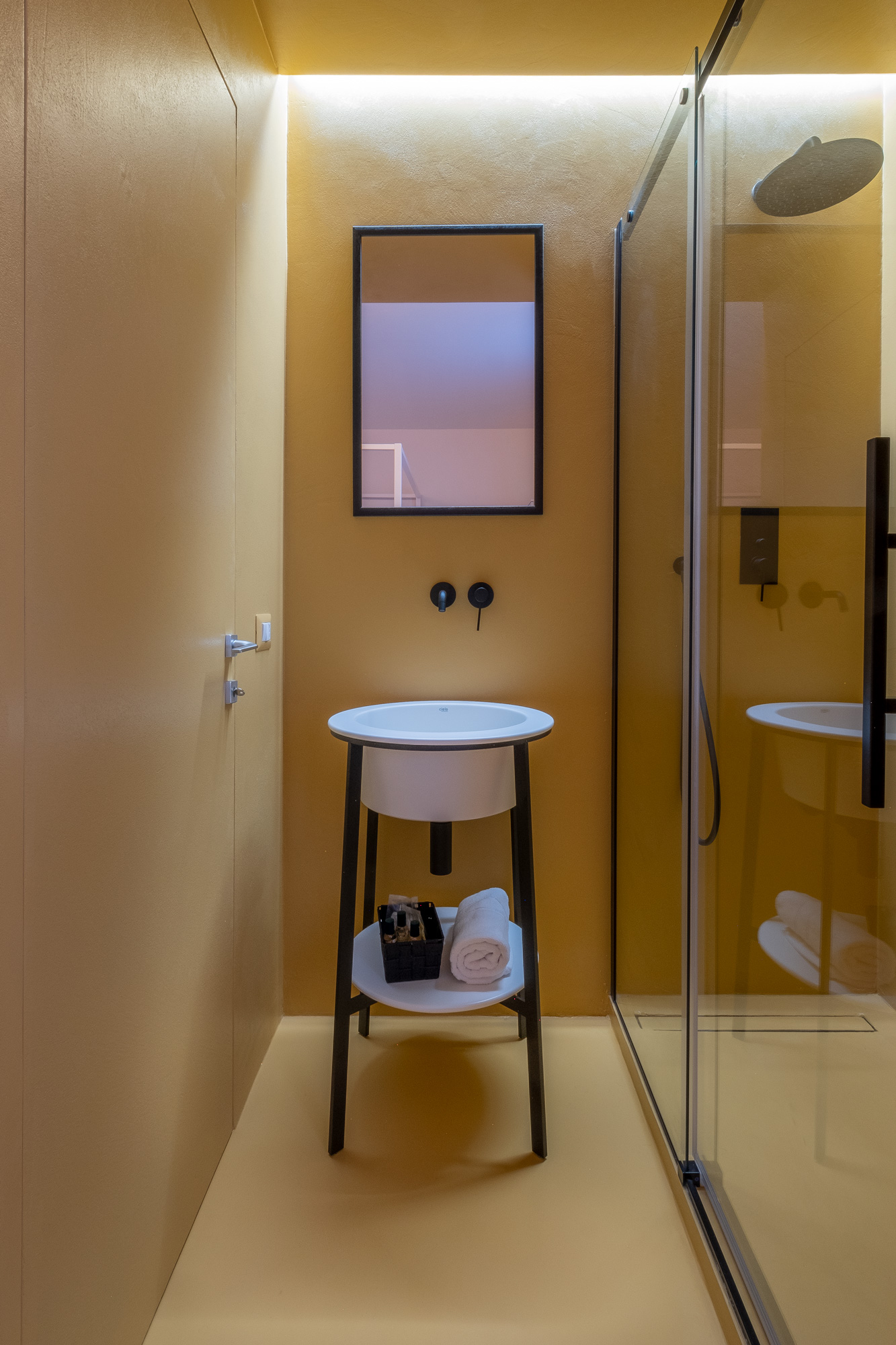 Le camere sono concepite come piccoli rifugi, luminosi e silenziosi, in cui il progetto d’interni è ridotto all’essenziale per lasciare spazio al benessere e alla qualità dell’esperienza. I bagni, in parte aperti verso le camere ed integrati ad esse con naturalezza, utilizzano finiture in resina, in tinta con la carta da parati che li “avvolge”, e rubinetterie nere opaco, per creare un contrasto moderno/industriale, con gli  ambienti rilassanti con cenni alla natura del luogo delle camere.