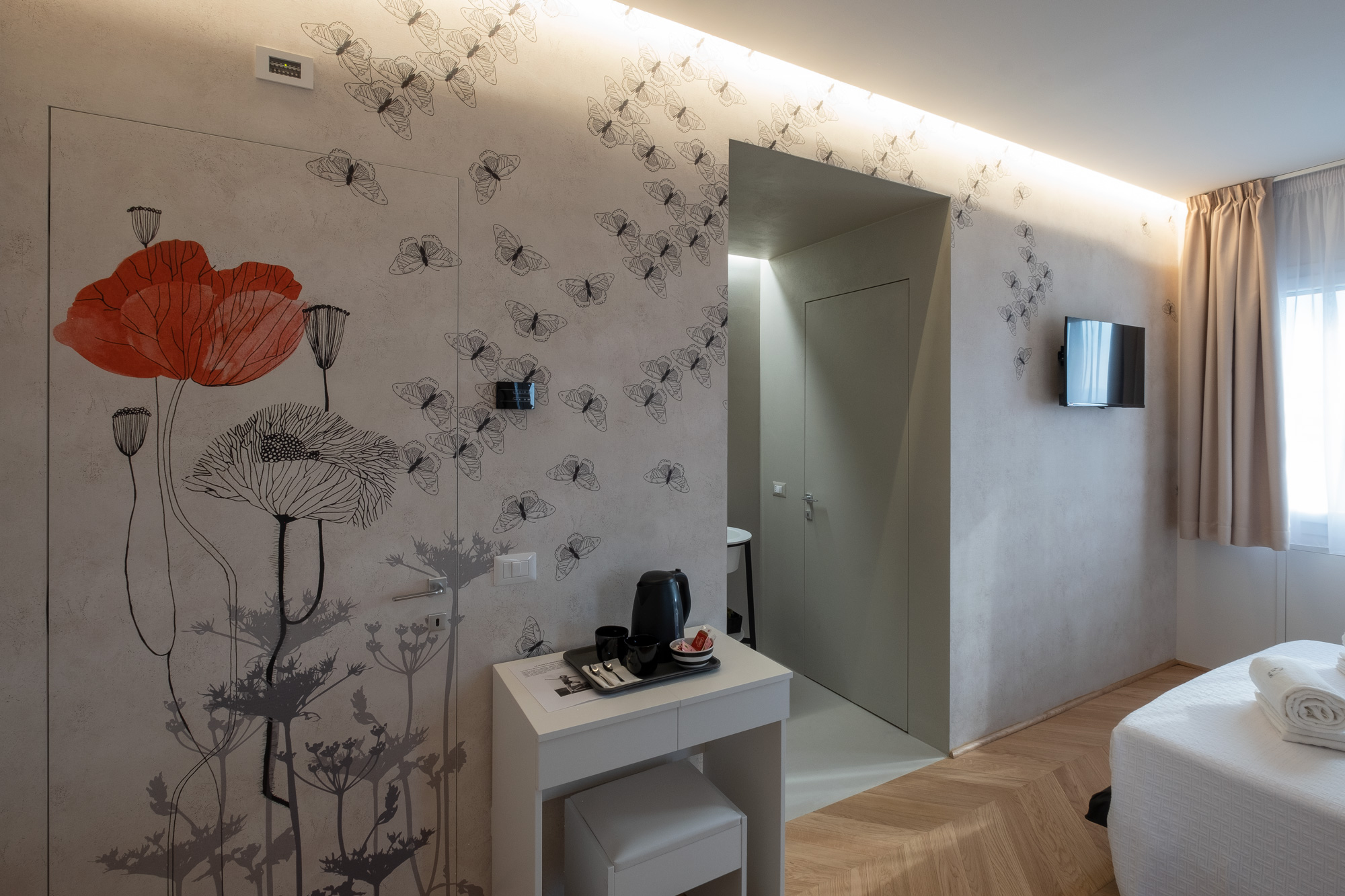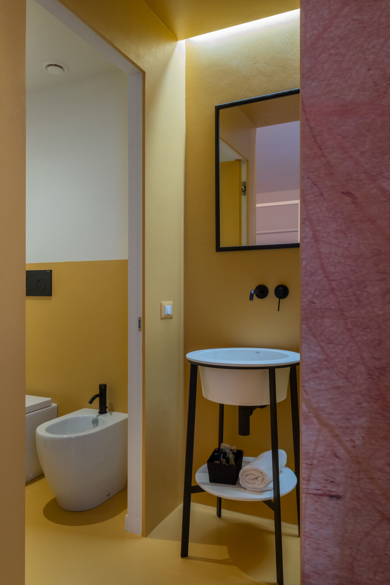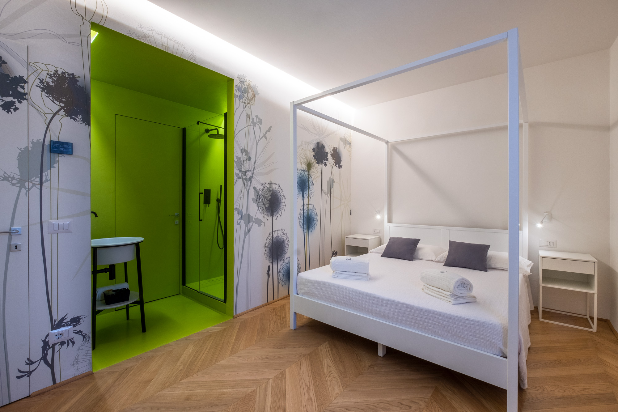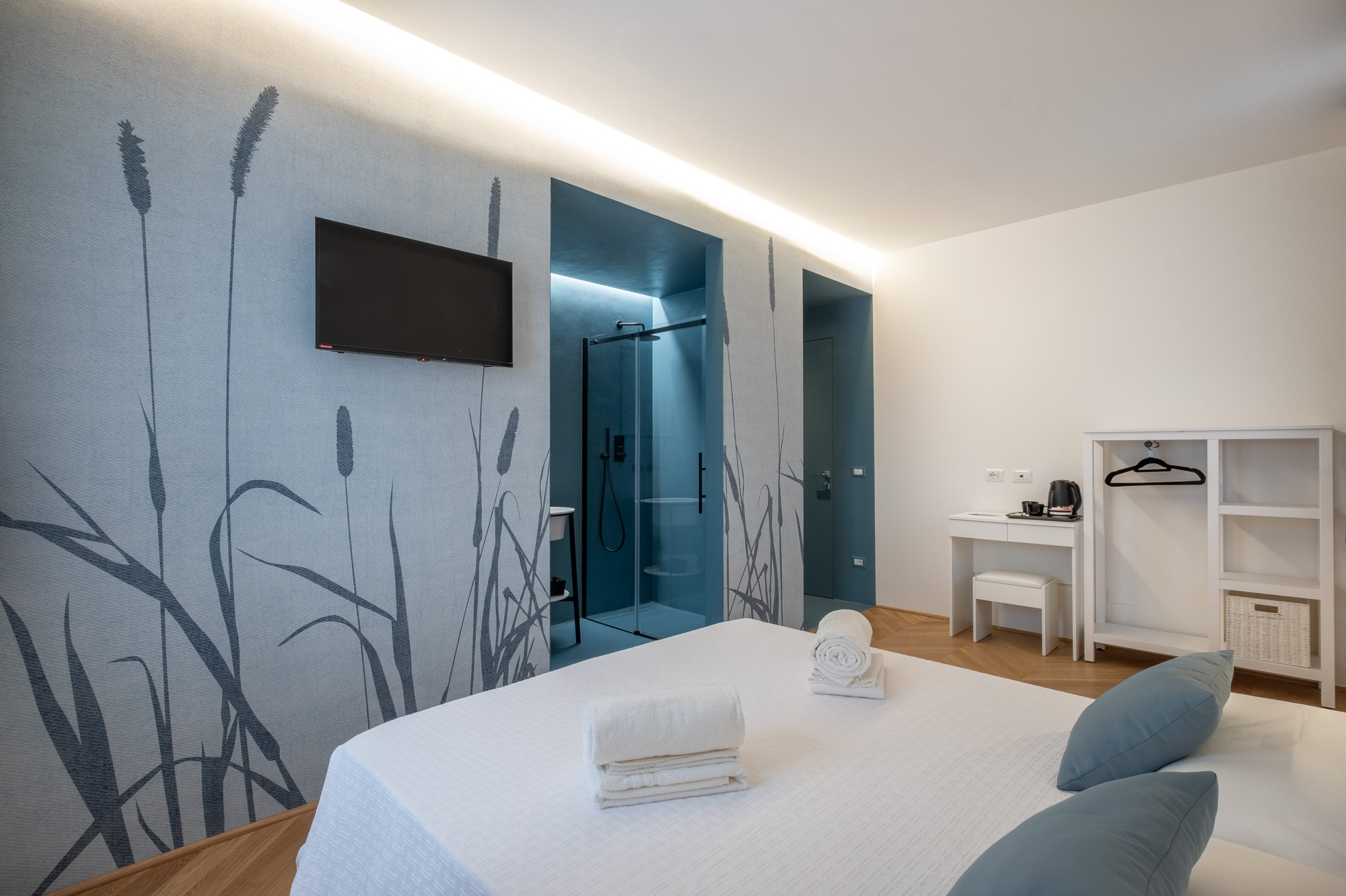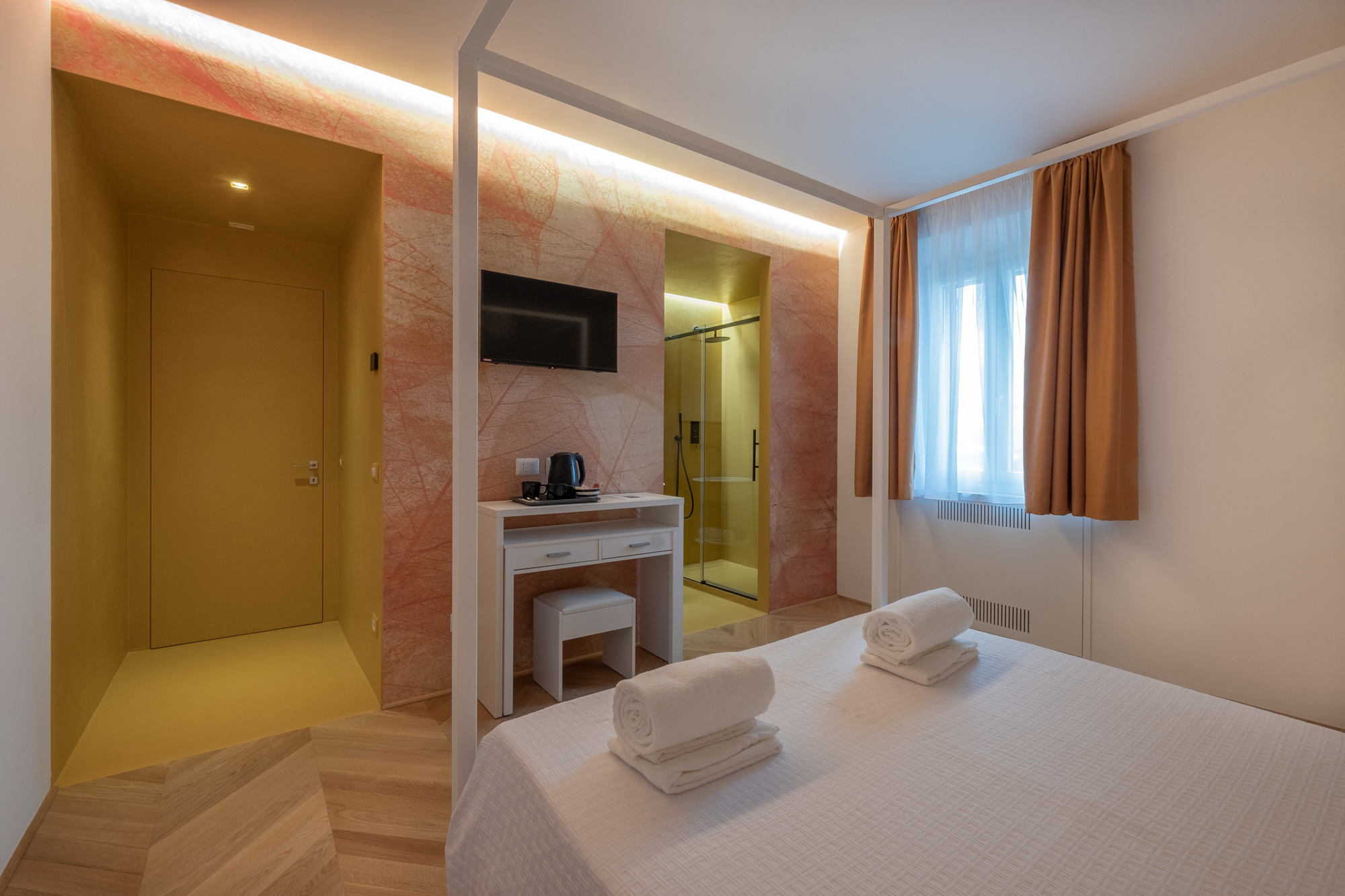 Le camere sono concepite come piccoli rifugi, luminosi e silenziosi, in cui il progetto d’interni è ridotto all’essenziale per lasciare spazio al benessere e alla qualità dell’esperienza. I bagni, in parte aperti verso le camere ed integrati ad esse con naturalezza, utilizzano finiture in resina, in tinta con la carta da parati che li “avvolge”, e rubinetterie nere opaco, per creare un contrasto moderno/industriale, con gli  ambienti rilassanti con cenni alla natura del luogo delle camere.