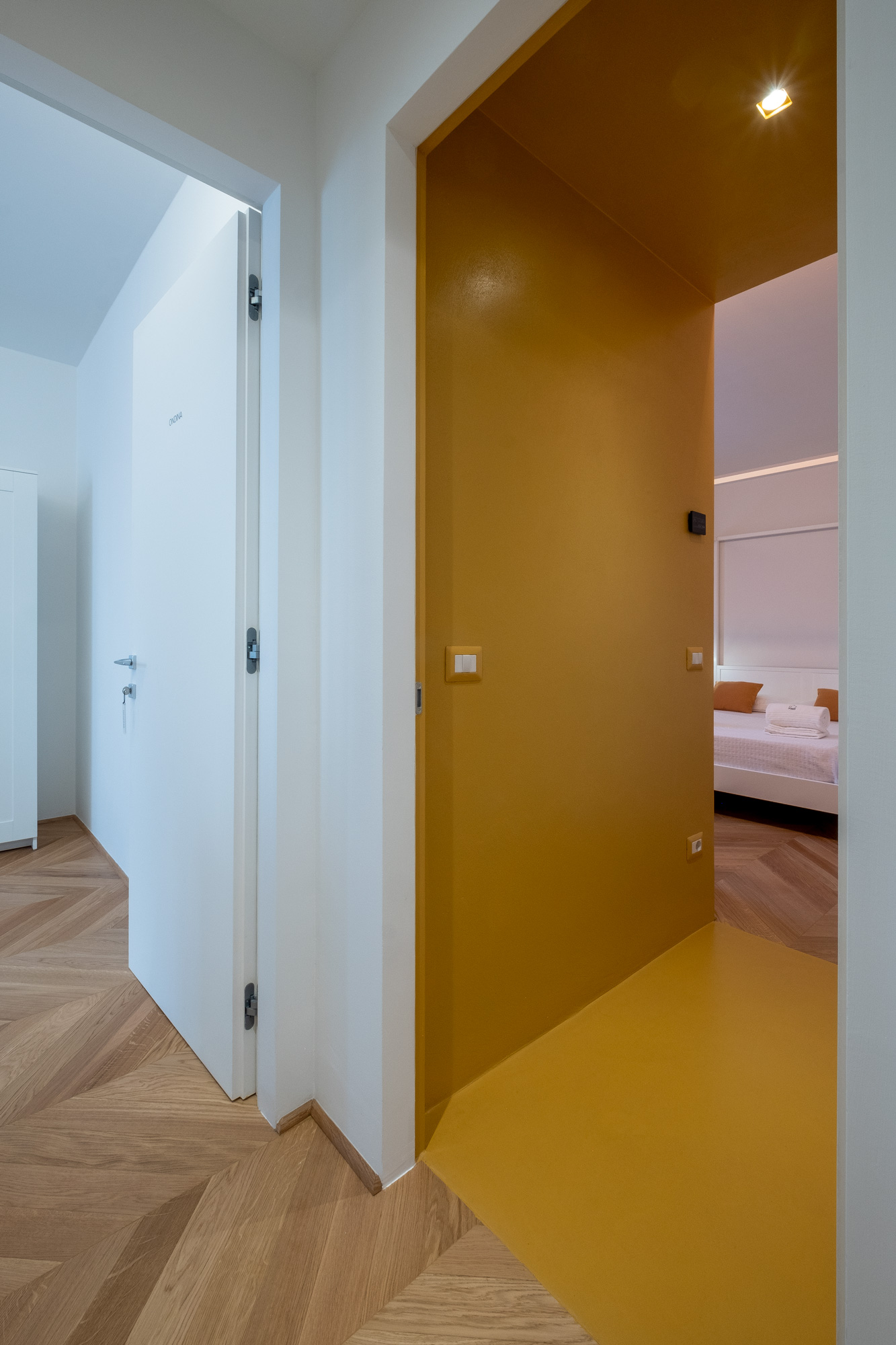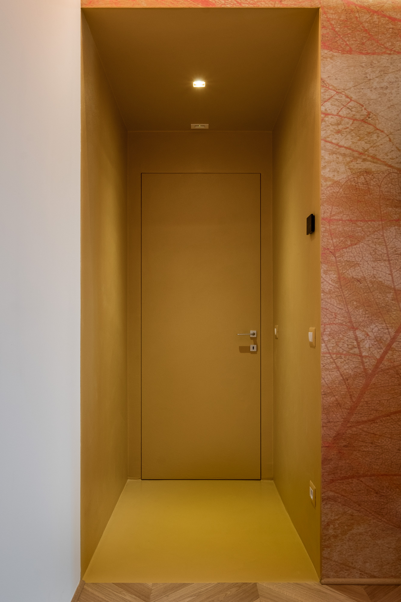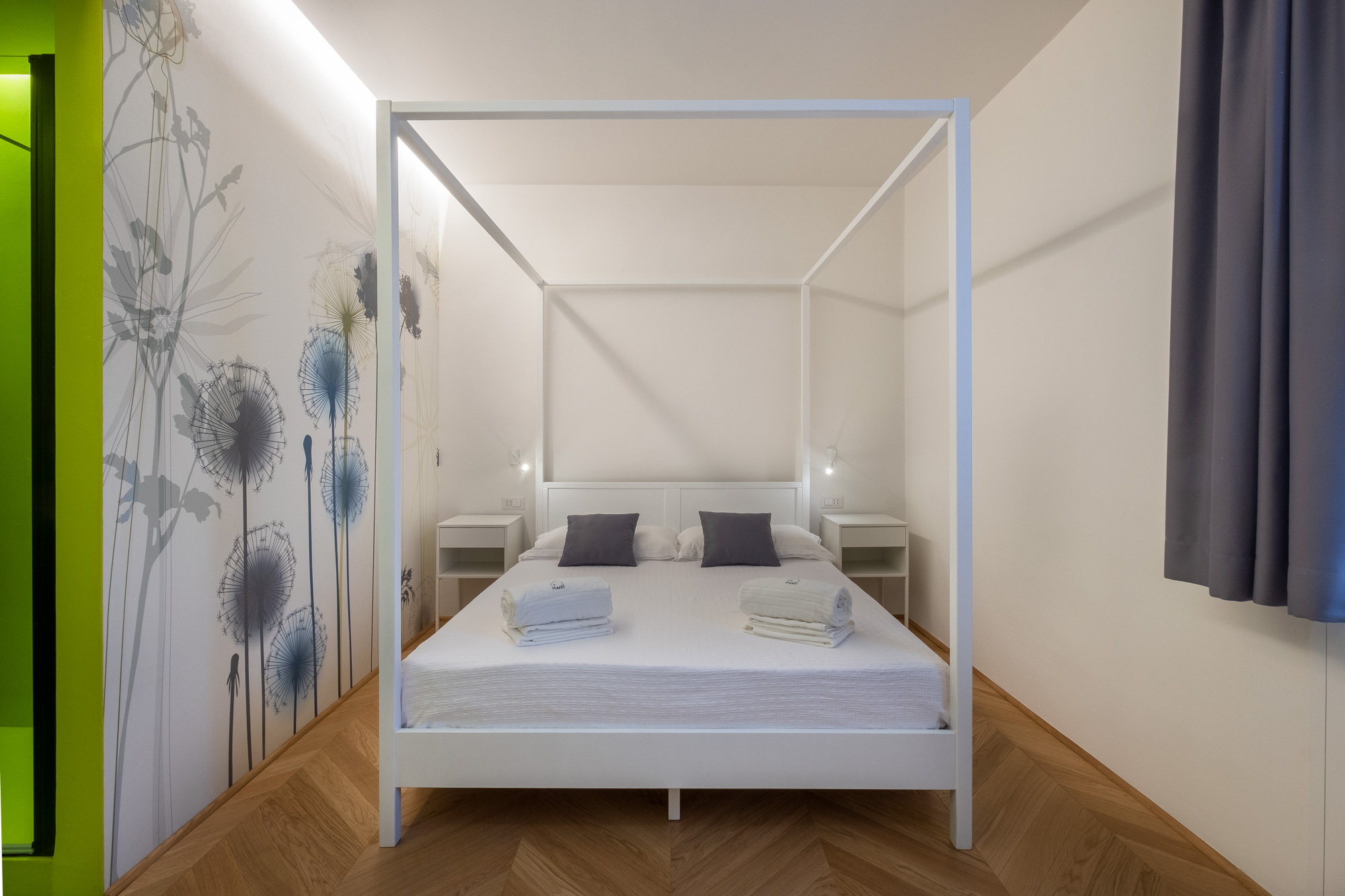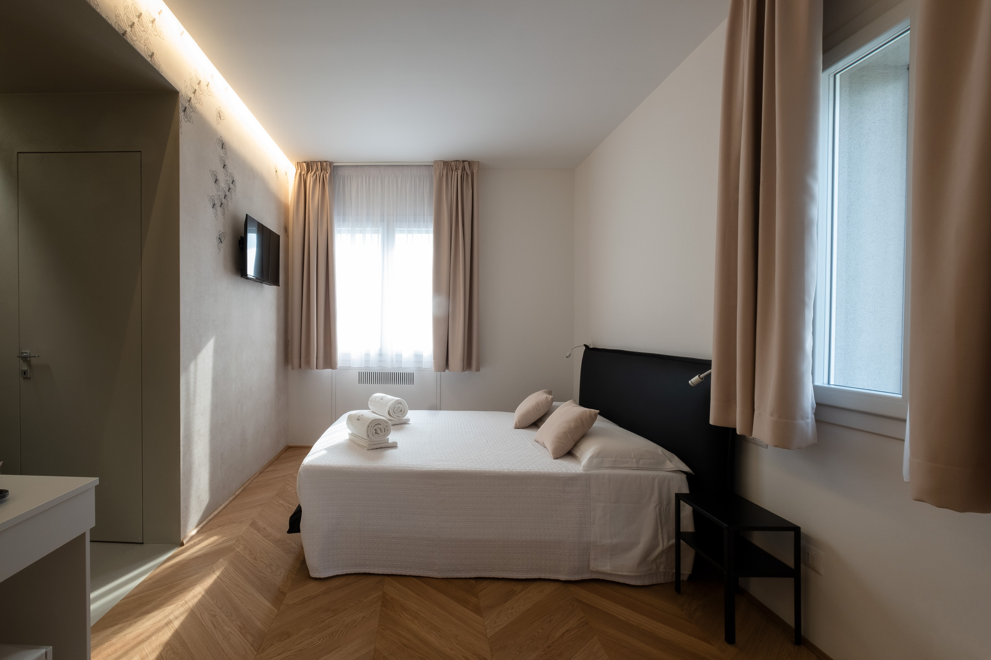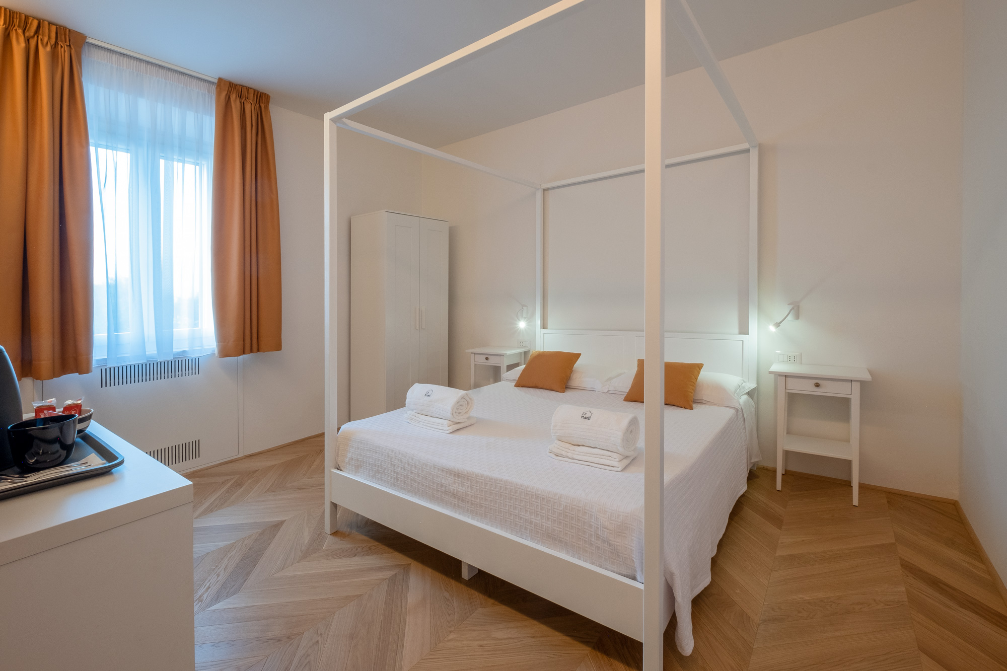 Le camere sono concepite come piccoli rifugi, luminosi e silenziosi, in cui il progetto d’interni è ridotto all’essenziale per lasciare spazio al benessere e alla qualità dell’esperienza. I bagni, in parte aperti verso le camere ed integrati ad esse con naturalezza, utilizzano finiture in resina, in tinta con la carta da parati che li “avvolge”, e rubinetterie nere opaco, per creare un contrasto moderno/industriale, con gli  ambienti rilassanti con cenni alla natura del luogo delle camere.