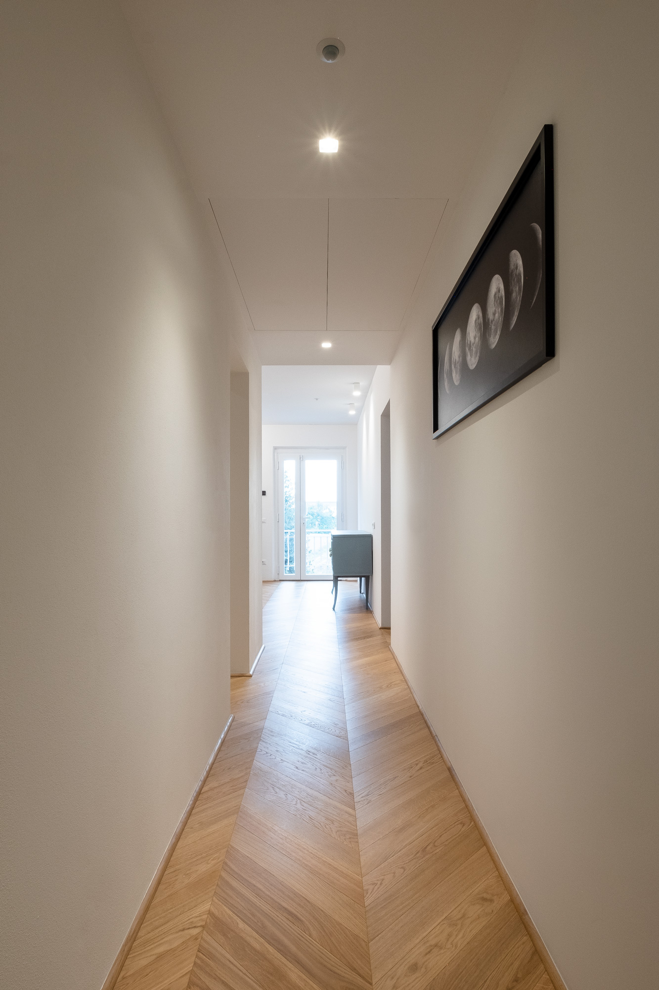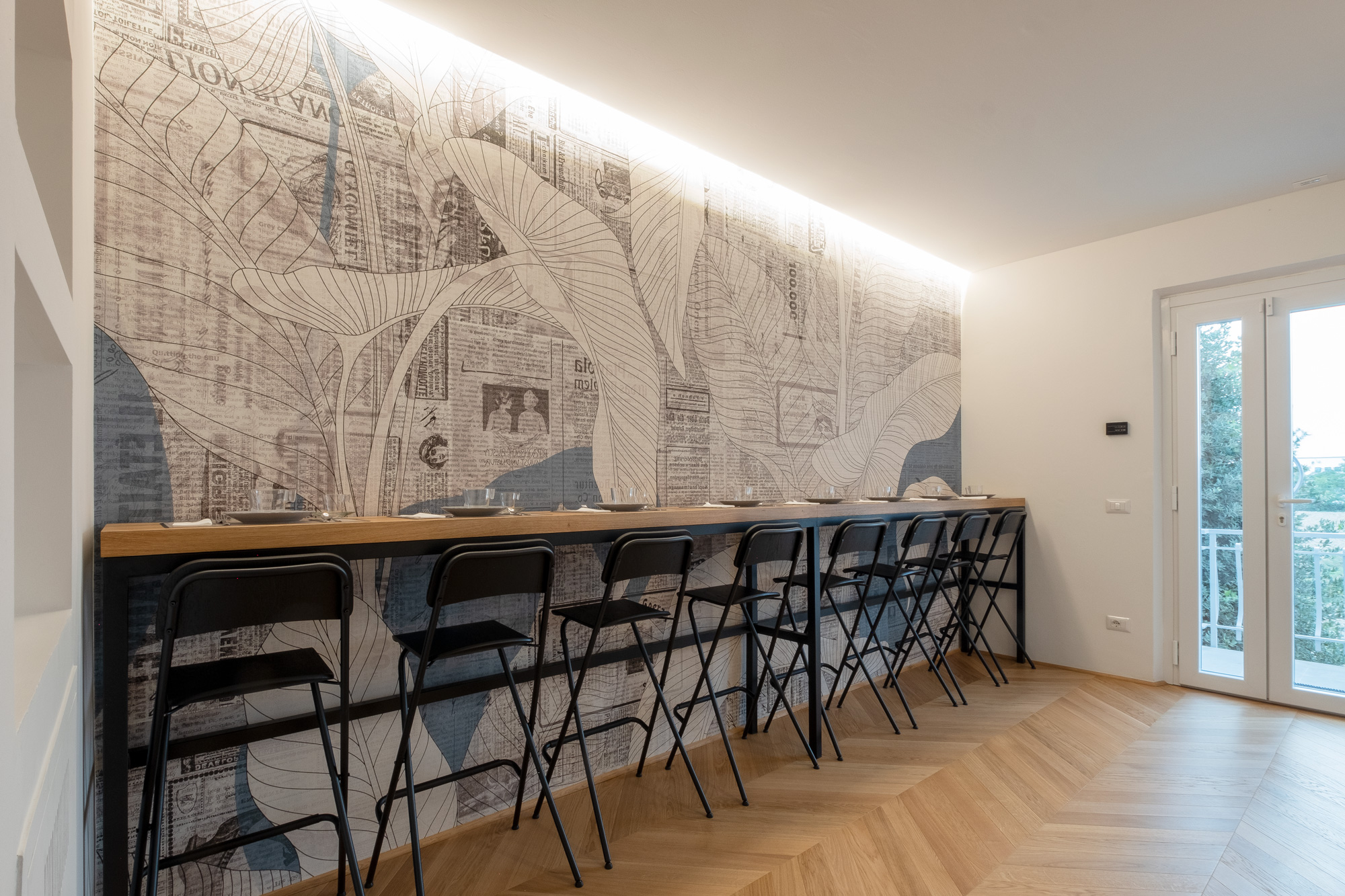 Lo stile degli interni riflette l’identità della committenza: un equilibrio misurato tra essenzialità contemporanea e attenzione ai dettagli, tra rigore progettuale e calore domestico. Superfici materiche, palette cromatiche morbide e naturali e pavimentazioni in legno di rovere posato a spina creano un’atmosfera avvolgente e senza tempo. Le pareti diventano superfici narrative grazie all’uso di carte da parati grafiche e decorative, che introducono segni botanici e texture leggere, capaci di caratterizzare ogni ambiente con delicatezza.