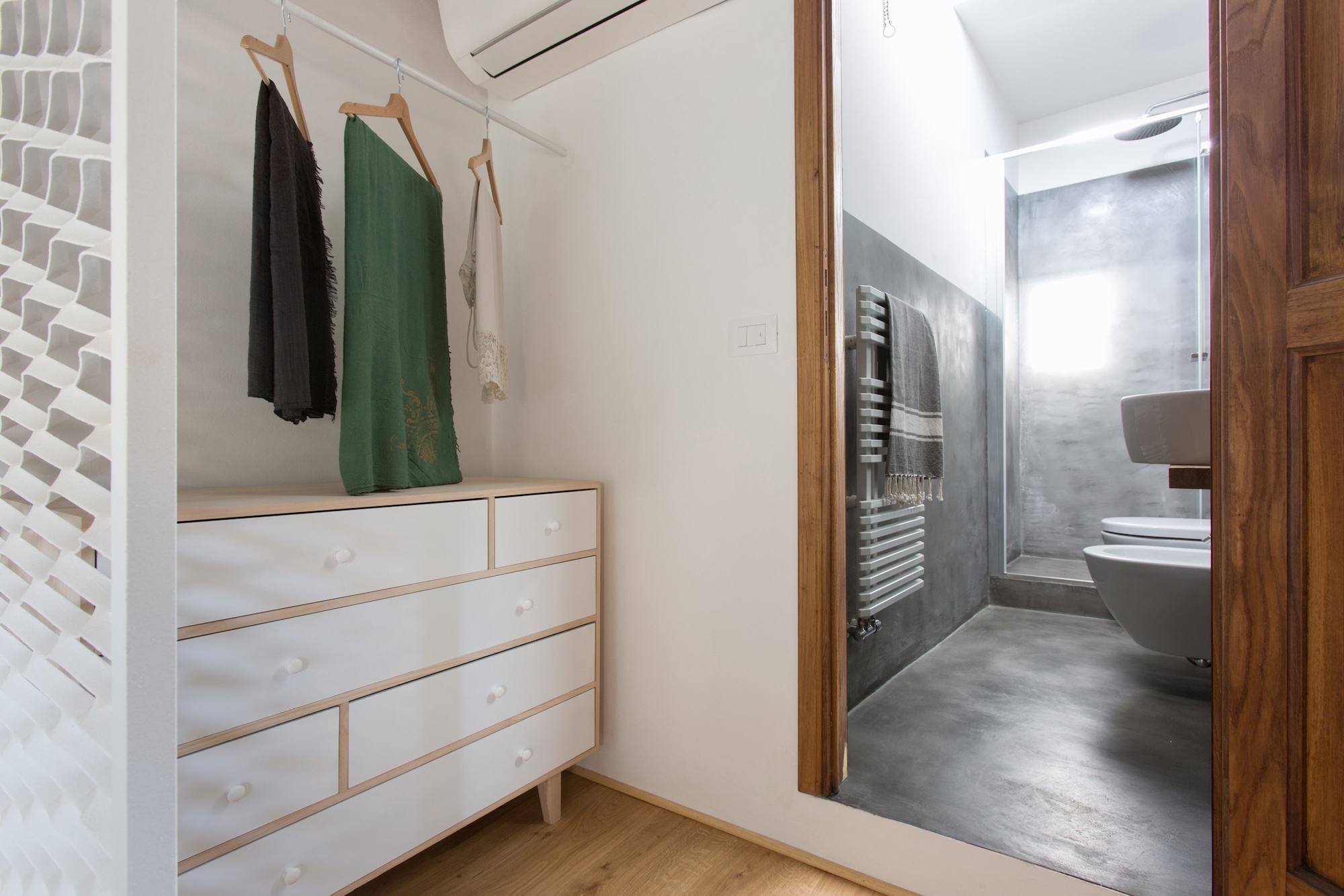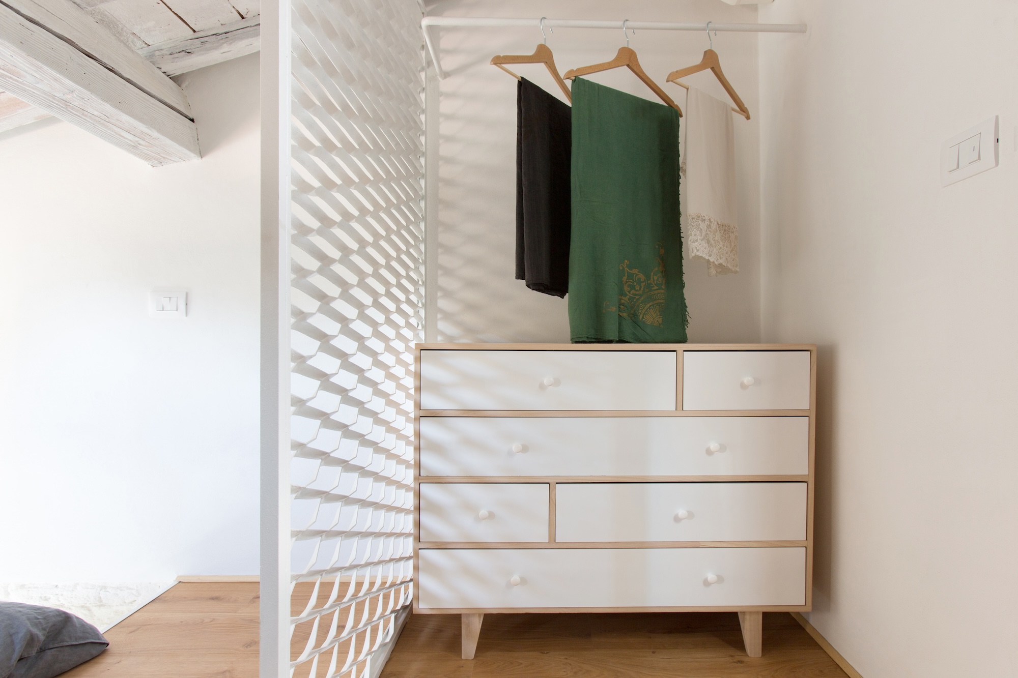 Il guardaroba, che funge anche da antibagno, è stato realizzato con un a griglia metallica intrecciata di color bianco.