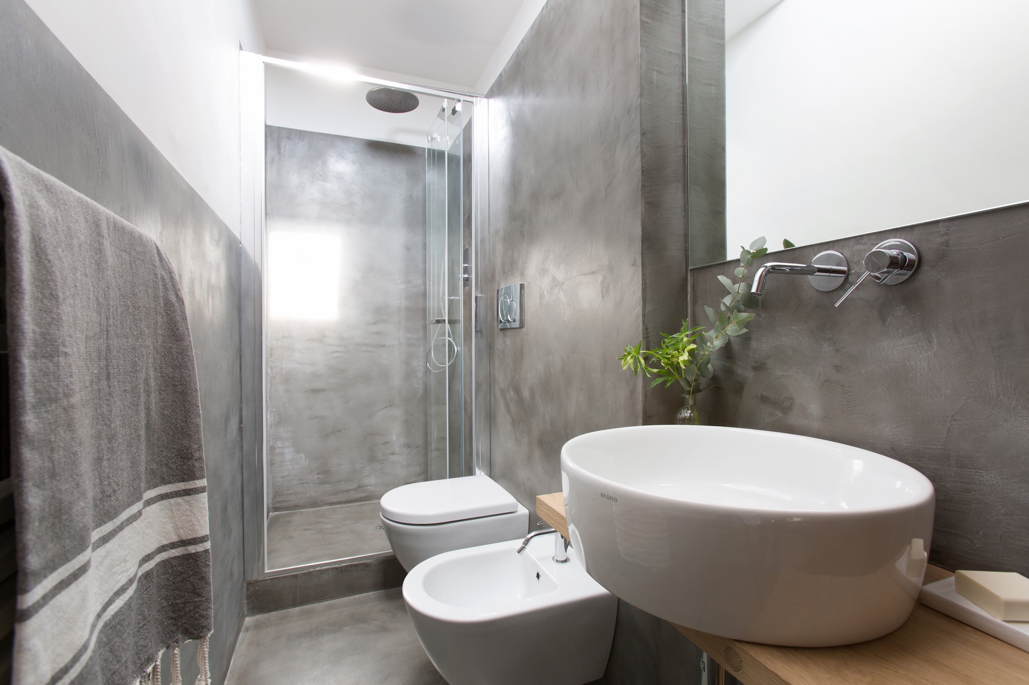 Il bagno, molto minimalista, è stato interamente rivestito con micro-cemento grigio sfumato ed è stato illuminato tramite strip-led posizionati sopra la contro-parete tecnica realizzata con lastre in fibro-cemento. Il lavandino, del tipo a “scodella” circolare, è stato appoggiato su mensola in legno massello di rovere. Gli altri sanitari sono di tipo sospeso.