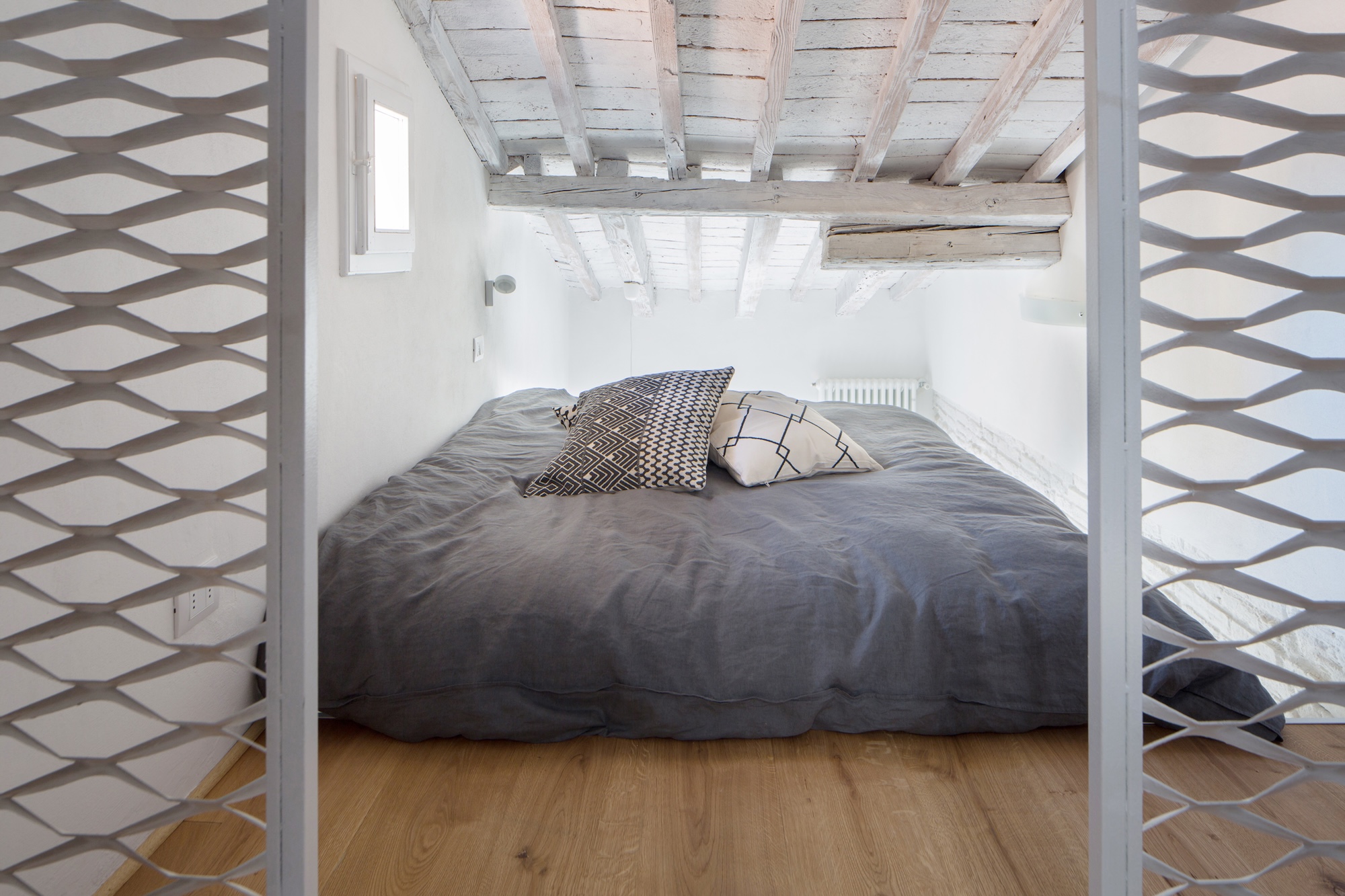 Ad esclusione del box in legno, tutto il resto della pavimentazione è stato rivestito con un laminato in pvc flottante (in sostituzione del rivestimento in micro-cemento previsto inizialmente) di color grigio sfumato che contribuisce a creare uno stacco cromatico e materico con il legno della zona cucina. Al piano superiore, dunque, è stata individuata la zona notte per dotare l’immobile, seppur molto piccolo, di una zona privata.