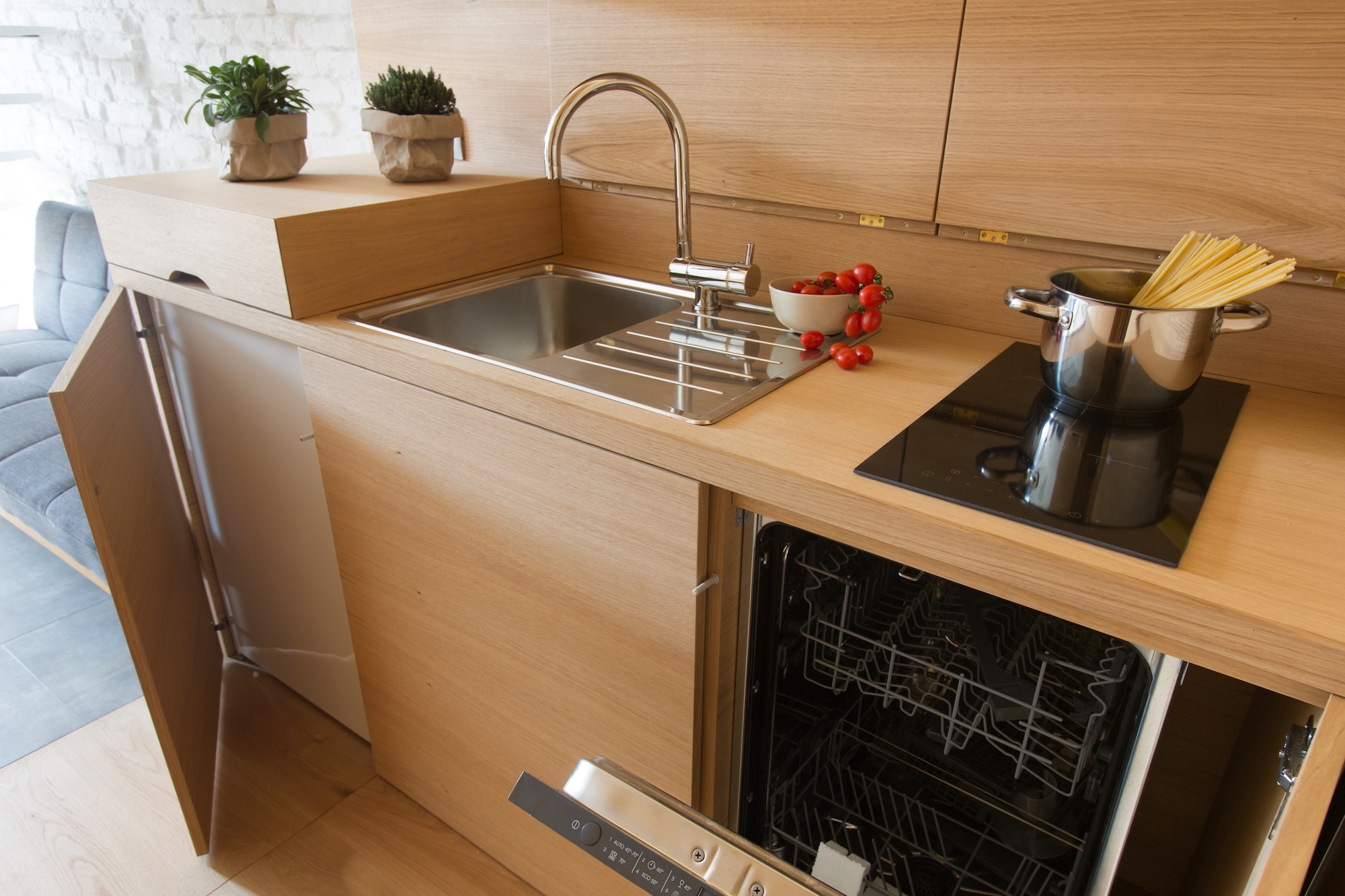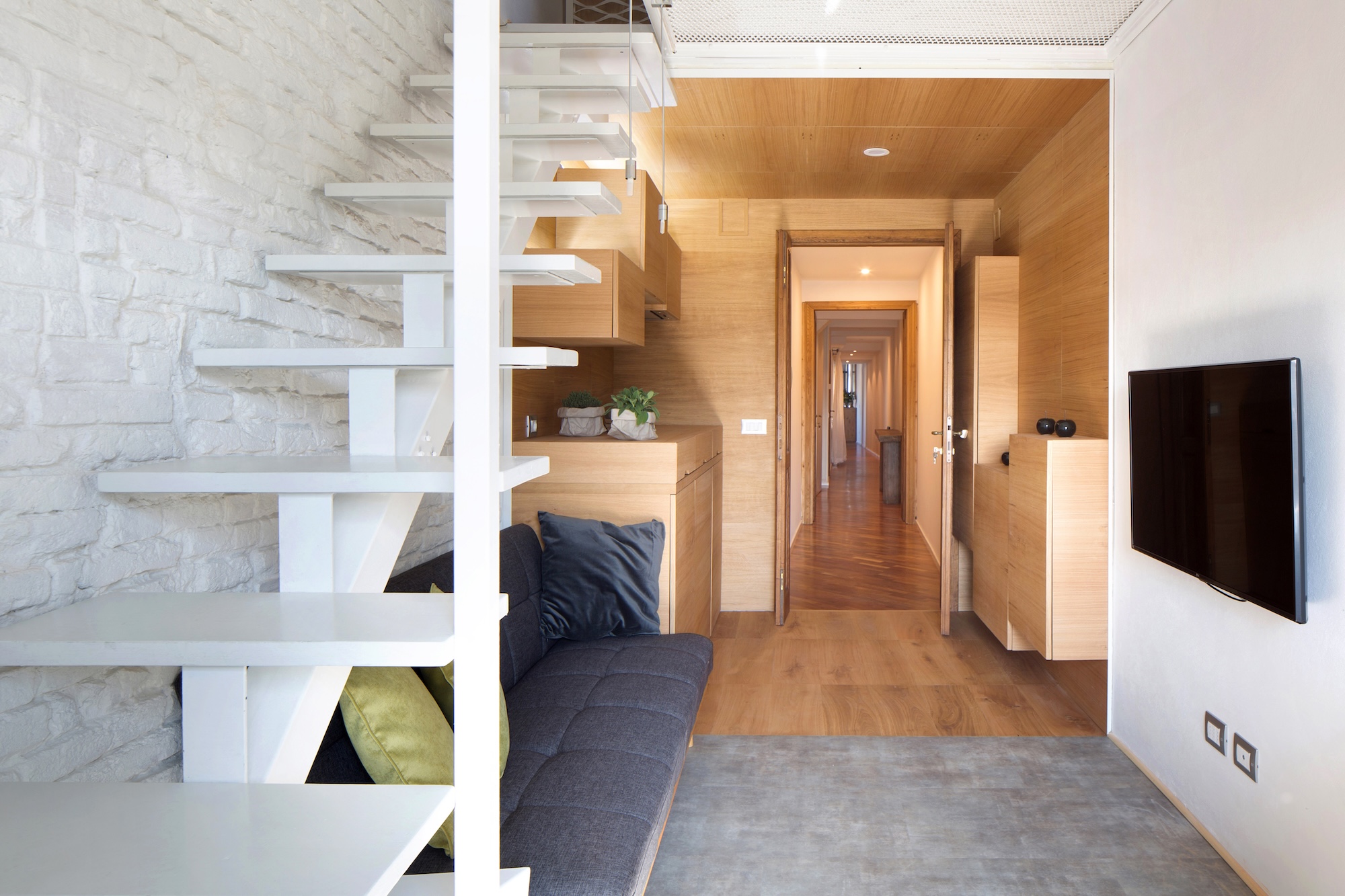 A tale scopo è stato concepito una sorta di “box in legno” rivestendo le pareti, il pavimento (flottante) e tutto il solaio superiore alla zona ingresso di tavole di rovere naturale spazzolato. I mobili della cucina, realizzati anch’essi con tavole in massello di rovere spazzolato, risultano mimetizzati ed inglobati all’interno del “core”. A differenza di quanto concepito inizialmente, il lavello ed i fuochi sono muniti di un coperchio apribile come le vecchie cucine, che all’occorrenza potrà fungere anche da piano d’appoggio. I pensili, compreso la cappa, sono stati concepiti come degli elementi satelliti che fluttuano sulle pareti della cucina con l’intento di creare uno spazio più dinamico e flessibile. La zona pranzo vera e propria è stata individuata in prossimità della finestra, così da godere pienamente della luce naturale durante la colazione e/o il pranzo. La zona relax, ricavata nella parte centrale dell’immobile, è stata dotata di un divano letto di design ad una piazza e mezzo, con  un’imbottitura in tessuto grigio e struttura in legno, un piccolo tavolino ed un punto TV.